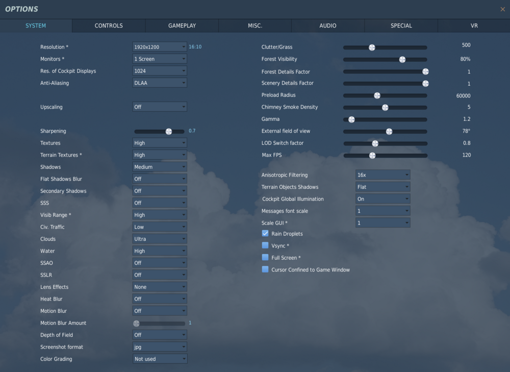 Thank you for posting your settings. I can see that I am not too far off from you. As said I run the G2 on 60Hz now including FFR and its quite solid. Need to test further in MP and stressful missions. In case it fails I will sacrifice the ultra clouds I guess. Maybe there is even room to crank some things up, but this will be done later on after more flight hours. For now its a good starting point. Thanks to all who helped me getting some clarity in this setup-jungle!