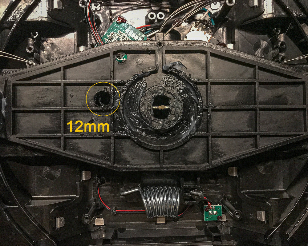Kürzlich habe ich hier im Forum um Hilfe gebeten, wie man beim den o.g. Pedals die Schwergängigkeit, insbesondere aus der Mittelstellung heraus, beheben kann. Zwischenzeitlich habe ich ein englisches Video gefunden, in dem sehr stümperhaft die kleine Druckfeder inkl. Kunststoffkugel entfernt wurde, indem die große Zugfeder und die mechanischen Bauteile aufwendig zerlegt wurden. Ich habe nun einen sehr viel einfacheren Weg gefunden, die kleine Druckfeder mit Kugelkopf zu entfernen, ohne Gefahr zu laufen, dass durch die Demontage der Zugfeder und Mechanik etwas kaputt geht und / oder die Zentrierung am Poti verstellt wird. Die kleine Druckfeder sorgt dafür, dass die Pedale in der Mittelstellung relativ stark zentriert werden. Für das Fliegen mit dem Heli muss man schon einen sehr großen Druck ausüben, um diesen Widerstand zu überwinden... Hier nun die Lösung - und welches Werkzeug man dafür benötigt: 1. Einen Kreuzschraubendreher (zum Entfernen der Abdeckung - auch an die 4 Schrauben in der Mitte denken, die sich unter den Gummis befinden) 2. Eine Bohrmaschine oder Akku-Schrauber 3. Einen Holzbohrer mit mindestens 12mm Durchmesser (ein normaler Stahlbohrer geht auch) 4. Ein Tuch oder Lappen, zum Abdecken der "Innereien" 5. Einen Staubsauger, zum Entfernen der Kunststoffspäne Wie auf dem Foto zu erkennen, befindet sich die kleine Druckfeder mit Kugelkopf unterhalb des Hebels auf der linken Seite. Auf der Unterseite des Hebels befindet sich ein Sackloch, in das der drunter befindliche Kugelkopf hineingedrückt wird, sobald der Hebel darüber bewegt wird. Bohrt man nun mit einem Holzbohrer an der erkennbaren Position ein Loch, kann man die Feder entfernen. Auf dem Foto habe ich die Feder samt Kugelkopf bereits durch herausdrücken mit einem kleinen Schraubendreher entfernt. Das war´s Danach die Späne absaugen und den Deckel wieder anschrauben. Bei mir hat das Entfernen und wieder befestigen der vielen kleinen Schrauben vom Deckel am längsten gedauert. Die Pedale gehen zwar nach dem Entfernen der Druckfeder wieder in die Mittelstellung zurück (was ja auch gut ist), der Kraftaufwand, der benötigt wird um aus dieser Stellung heraus zu kommen, ist aber minimal.