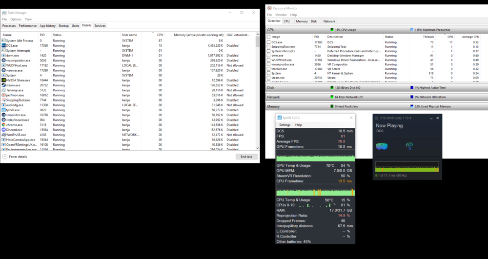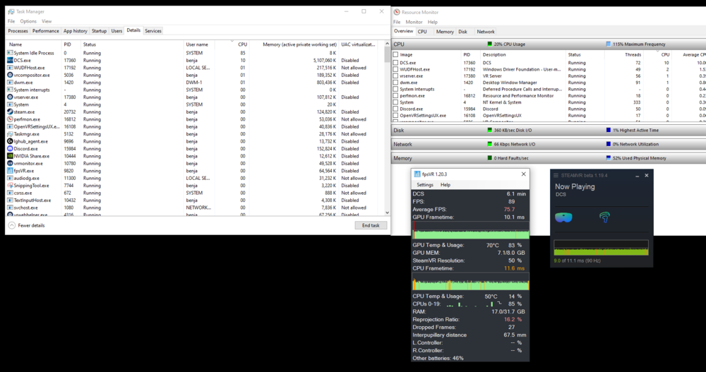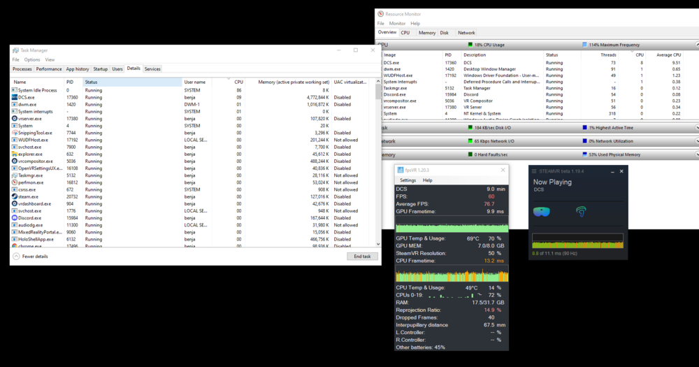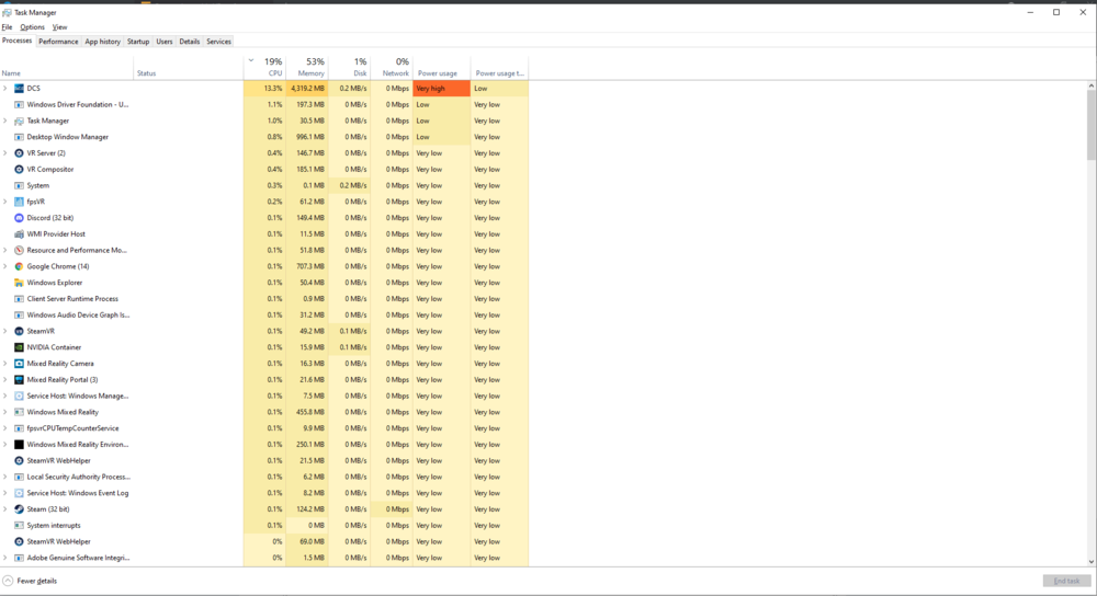Hello again, @speed-of-heat yes this is very worrying to me that my cpu is doing that. I waited for things to settle like you suggest and out of nowhere... A few minutes later. (with Chrome open in the background) Eager to see if this wasn't a lucky try. I stopped the mission then pressed Fly again It sometimes went up to 80 to 90fps when i'm not doing anything. It is extremely confusing. I started SteamVR, then the game from the light home menu (just the menu not the 3D room), started the mission then fpsVR and there we go. I swear on everything i cherish including my sister sitting right next to me that i changed NOTHING, did not even reboot we just did 3 hours of Baldur's Gate 3 online. Thank you again @speed-of-heatfor taking the time to suggest that! What the hell. @DucS2r I don't seem to find the processes you mentioned in the task manager and i don't have anything weird running i think. CPU is idling at 20% with DCS being 14 to 15% of it. I will keep an eye on it though thank you very much for the tip. The top of my processes stack just for reference. (17minutes in)- 19 replies