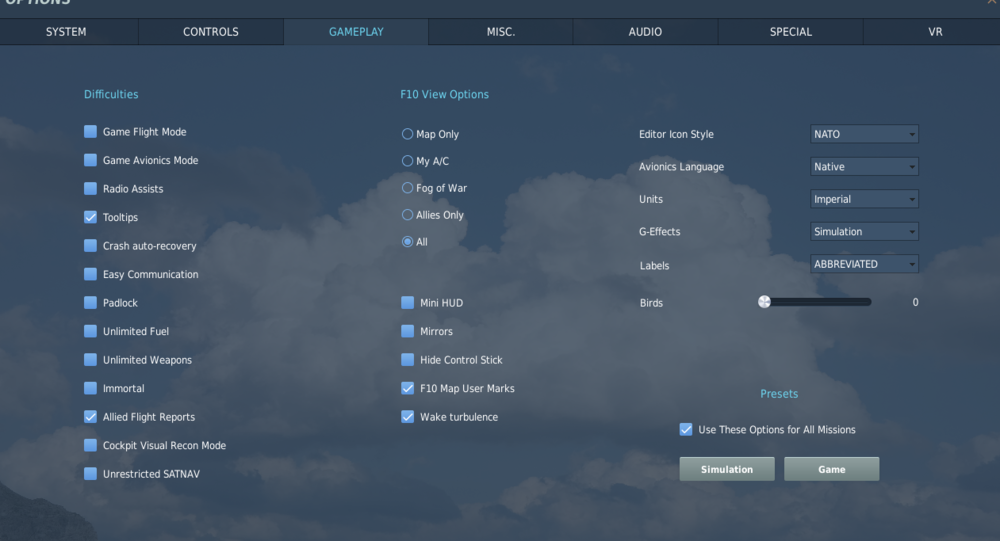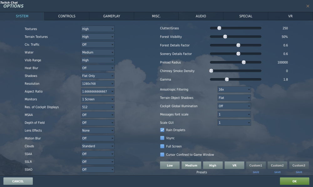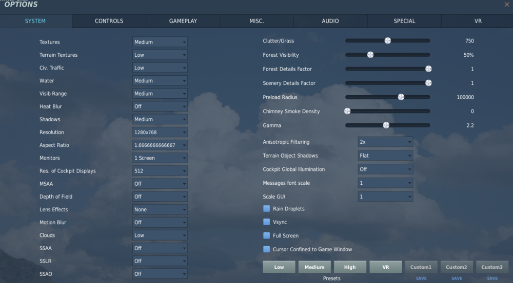 Hey guys just a quick update, First of all thank you @peachmonkey @RealDCSpilot and @Rebel28 for all your suggestions. I have spent some time looking at my computer first and foremost because as we discussed, it felt extremely weird to me to see very different results depending on where the game was launched from, if it was the first mission loaded or not, etc, etc. The first thing i did was to buy a new power unit. I went from a BeQuiet 650W Bronze to a Gigabyte 850W 80 Gold. Right off the bat, the weird behaviors of going from 25 to 80 (and back forth) fps at the lowest graphics were gone. I suspected a power issue after some benchmarks made in Cine, Prime and CPU-Z and it got fixed. Then i downloaded the beta version of SteamVR instead of using the Main one. I discovered in the process that DEPENDING from where i launched the game, the SteamVR settings changed. (I can launch Steam then SteamVR, i can launch WMR for SteamVR or i can launch DCS.exe then tick start VR) -> One of the main issue was that sometimes I had Motion Smoothing On in global and "Use Global Settings" in DCS Video settings, sometimes i had it off global and force always-on in DCS Video settings, etc. It might just be placebo, i don't know, but i'm now always launching Steam, SteamVR and then withing SteamHome light, start DCS. This way i know i'm always using the following (and final) settings all the time: Then I spent some time figuring out the visual settings I was comfortable with whilst maintaining 45/50fps minimum. As a reminder, i'm not chasing frames, I want to have some headroom for recording and obviously for multiplayer, heavier missions, Marianas type of maps, etc. Here are the settings in DCS: Pixel Density at 1.0 and Force IPD Distance disabled in VR. Just to summarize what i "prioritize" when i'm playing (which obviously could be very different from somebody else): -Textures: I did not buy a high resolution headset to look at pixelated textures -> High -Terrain Textures: DCS has incredible maps and being able to use the terrain colors, aspect, textures, etc as a point of reference whilst flying (i mostly do CAS) is really important, i'm a ground hogger -> High -Civ Traffic: Hum, nope, thanks. -> Off -Water: I fly from or to a boat sometimes but it's not really my main concern, also the medium setting is fine enough for me in terms of visuals -> Medium -Visib Range: It was one of the main perf killer for me, i bumped it up to High and locked it here. I'd love to have more but I can't right now. -> High -Heat Blur: I don't care honestly and it gives me motion sickness -> Off -Shadows: Another perf killer for me. I want shadows because without it, it looks like you're back in 1999. Flat are enough for me, for now at least. -> Flat Only -Res of Cockpit Displays: I don't use mirrors (again, not a dogfighter. If i need to check six, i just turn in VR) so I don't really care and the screens are pretty sharp thanks to the G2 already -> 512 - MSA/DoF/Lens Effects/Motion Blur/SSAA/SSLR/SSAO: all off or none. I tried them on, obviously MSAA is pretty cool to make the edges smooth but seeing that i loose 20fps and get stutters by just activating x2, it's a nope. SSLR helps with immersion but I'm also noob enough that i don't need reflections on my displays that are going to stress me even more 'cause i can't read sh*t ^^ -> Off/None -Clutter/Grass: not gonna lie, it looks aweful. But it looks even more old school and 1999 with grass off. I found a setting of 250 that i like, i have grass right next to me, it does the job -> 250 -Forest visibility-> 50%, i'm thinking of bumping that to 60/70 (read below why) but I know that it is a safe, perf/eye friendly setting. ->50% -Forest/Scenery factor-> Following @Underscore's suggestion, i tuned that down to 0.6. Honestly i don't see much difference visually, I do see the improvement in smoothness though especially when in flight and looking at cities in Persian Gulf, I don't have stutters anymore and way less clipping as my system is able to load em' up faster.-> 0.6 -Preload radius: 10k. I haven't really seen a difference between 10k and the maximum of 15000k. Might be because i mainly fly (way) below mach 1. -> 10k -Anisotropic Filtering: I like to have straight and well-defined textures/objects in the distance so i bumped that up to the max -> x16 Cold & Dark Hornet in Vaziani in the .miz I provided earlier: 50 to 60fps, goes down to 40-ish with FLIR and MAV open on both DDI and obviously the bird running. I then spent some time to OC my GPU, RAM and CPU to get a little oomf in performances I was running 10 cores at 4.3Ghz turbo and 2.4Ghz cache, 2133Mhz for the RAM speed and stock settings for my RTX3070 of 1755Mhz of core clock speed at 7000Mhz of memory clock. After spending some time overclocking whilst remaining at 80° max core CPU and core GPU package in Prime or Cinebench, I found my sweet spot at 10 cores at 4.6GHz turbo and 2.8Ghz cache, 3600Mhz for the ram, RTX3070 at 2100Mhz core clock, 8000Mhz memory clock. Under workload in DCS my CPU and GPU barely reach 70° so I'm fine with that and it's super stable (no BSOD whilst playing in VR so far). Cold & Dark Hornet in Vaziani in the .miz I provided earlier: 65 to 80fps Hornet hot i got 55-ish with FLIR and MAV open on both DDI Oh and I forgot to mention, all of this at 100% SS in SteamVR. I should be able to bump the graphics settings up but I'm honestly quite happy with that for now. It allows me to record/stream on a single computer setup at a steady 45 in the VR version of the Tomcat or in Marianas in the F16 with Chrome running, Spotify and some good ol' dogfighting playlist and some other perf monitoring stuff. Thanks again to y'all for helping me. Now I need to figure out the same stuff for MSFS SU5 ^^- 19 replies