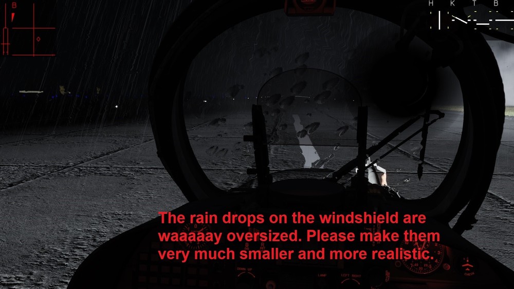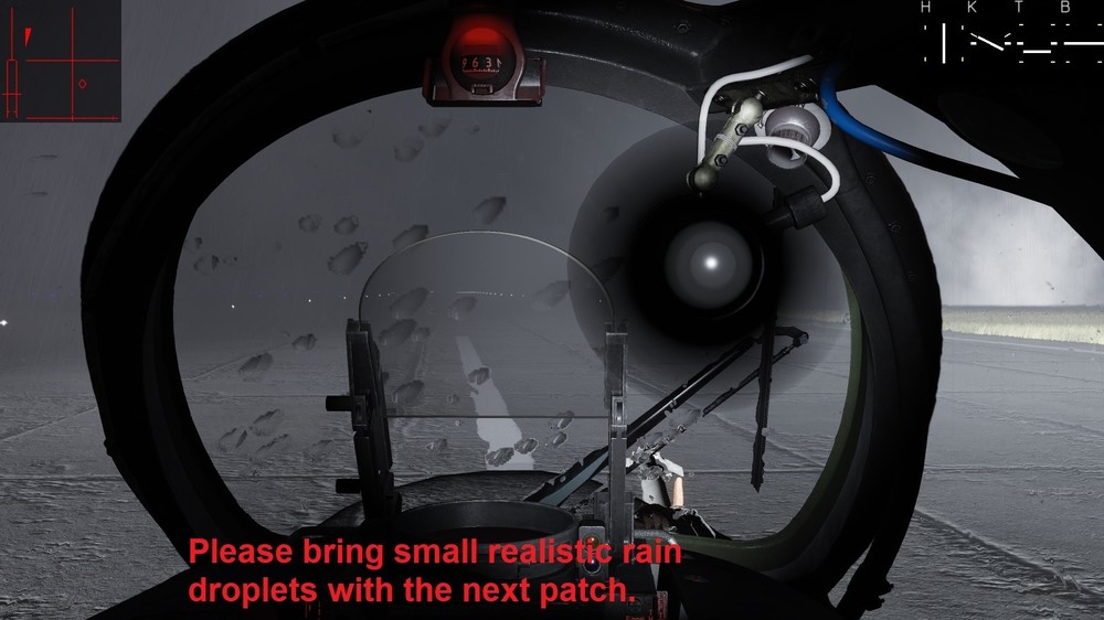 Hi developers, today I have noticed the first two bugs on the precious and very well programmed Hind. 1.) the turn knobs for the cockpit illumination on the lower side of the main panel are lit, but they are not lit on the right electric panel. 2.) the rain drops on the front windshield are unrealistic oversized and look like 10 inch sized water drops - please make a rain effects on the windshield with very small droplets like rain on glass would look like, for example as beautyful and realistic as on the beautyful F-16 canopy. Keep on doing your great work with that Hind, it´s an absolut fantastic helicopter!