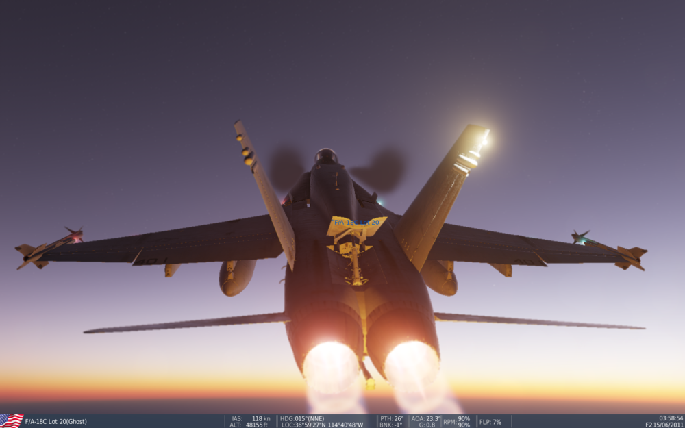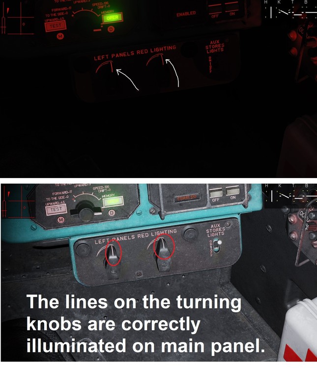 Good evening jet fighter aces, I have noticed that the cockpit illumination of the Tomcat is no longer working the way it was the last time I have flown her at night. The white and red flood light is no longer working, the red light bulbs mounted under the cockpit cover light up when switching red floodlight on - but the cockpit stays fully dark except gauge illumination (see screenshots.) Plus the cockpit is fully dark at night from the outside view, no HUD no instrument lighting - only the position formation and anti collision lights are visible when looking at the Tomcat at night with the outside camera view., while the cockpit is absolute black. There should be at least a slight red glow coming from the cockpit at night for realism during night flights and while enjoying the superb graphics of the Tomcat in the evening and night time from outside views... Please fix this the next time you update the Tomcat, thanks