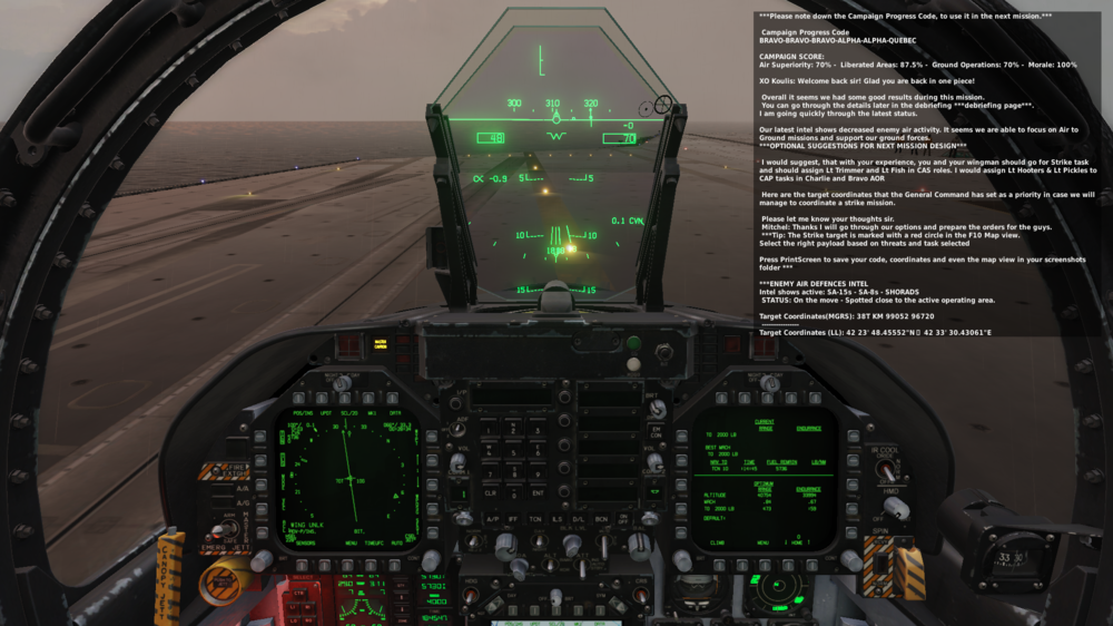 Hello, I encountered the same problem with the campaign that I started and finshed last week with DCS 2.7. On the first real mission I sent a cap to bravo and one in charlie with 10*aim-120c+fuel, and two SEAD with 4*harm+fuel. Result: a LOT of enemies planes downed, Air sup 20%, Liberated aread 25% Ground op 1%. (code at end = HHEAHZ) From here I encountered only 2migs-29 in every mission, that were quickly disposed by a lone bravo cap. After the 2nd mission Air sup 6%, Liberated aread 25% Ground op 88% (EHFGCM) Then Air sup 20%, Liberated aread 37.5% Ground op 1% (HCEABU) Then Air sup 40%, Liberated aread 50% Ground op 1% with very bad weather. (DDEAIR) At the end of this mission, I had the "end of mission bug", that is not related to this campaign. But it means that every mission from there was done with the bad weatHer (clouds from about 4000 to 20000 feet), so I did only drop JDAM/AGM154-C using targets coordinates from the F10 map. The good thing about it is I'm a pro at doing precision instruments case3 approach now. Then Air sup 60%, Liberated aread 62.5% Ground op 1% (JIEAJZ) Then Air sup 60%, Liberated aread 75% Ground op 1% (JJEABK) Then Air sup 60%, Liberated aread 75% Ground op 50% (JJIAGK) Then Air sup 70%, Liberated aread 87.5% Ground op 1% (BBEAFZ) Then Air sup 70%, Liberated aread 87.5% Ground op 70% (BBBAAQ) Then Air sup 60%, Liberated aread 100% Ground op 1% (JGEAKK) Then Air sup 60%, Liberated aread 100% Ground op 70% (JGBAOP) Then after a last mission: campaing victory. What I found quite disturbing is that the group assigned to strike were only destroying a few targets, and then were retreating with >=80% of the bombs when plenty of ground targets were remaining in their attack zone. (I was giving each plane 8various bombs+fuel+laserpod) From about the middle of the campain until the end, CAS assigned group were not dropping a single bomb. Also in the mission editor, the player group is assigned with CAP, and I think that prevent the wingman to really attack ground targets or air defense, since he think his task is CAP. It was were rare to get him to drop bombs. So the best use was to give him 10*aim120-c+fuel and tell him to go searching bandits, even if the lone bravo cap was totally sufficient dealing with the very few ennemies planes. Another thing is that even if you give bombs or AGM65 and such to the SEAD flight, they do not use it. They only fire HARMs to SAM with great coverage. The won't chase down smaller coverage SAMs even if they encounter those. I wonder if to get more planes, one should send a flight of 10 planes north of bravo with 6aim-120c+3fuel each? Because on the debriefing it was always written about 4/39 ennemies planes killed. So I bet quite a lot of red planes are idling on the ground. I'm sure the intended campaign experience wasn't just to mark the strike target on the mission editor, take-off, rise to 20000, drop a single AGM154-C, and go back to the mother, so perhaps a late DCS update broke everything Best regards, Z0mb13