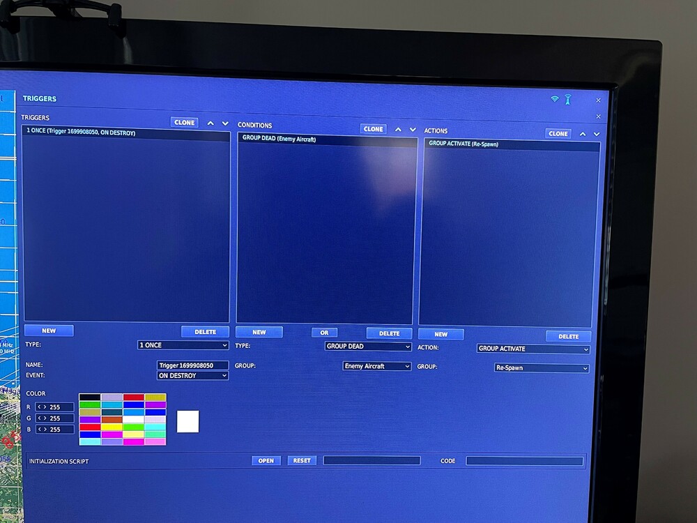 Hello, I am trying to learn how triggers work in the Mission Editor. What I am wanting to happen is,, once I shoot down the first enemy I want the next one to spawn in. Making it so I can face one opponent at a time, and not have to reload after each kill. I have entered in the following trigger information and non of it is working. "Trigger" Type: Once Event: No Event (also tried On Destroy) "Condition" Type: Group Dead Group: Enemy Aircraft "Action" Action: Group Activate Group: Re Spawn Aircraft I have also tried other kinds of combinations, just cant remember them all. I have tried to follow youtube videos but still no luck.