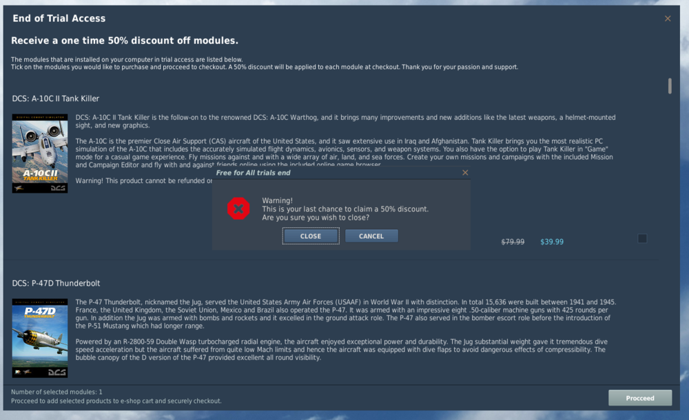 I am a new DCS player (about 1 month ish) and logged in for the first time today, looking forward to using the new 14 day trial option, to work out what module(s) I want to buy for my first purchase. As soon as I opened up I was greeted with a screen telling me my trial access had ended and if I try to close I get this warning that it is my last chance to claim my 50% discount.