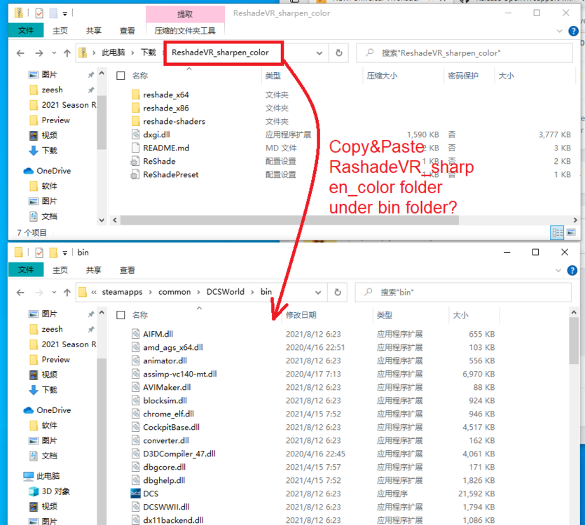 Hey guys, I just saw this thread and although I've read most of the post but still have a few questions and appreciate if anyone could clarify, thanks. 1. Copy and paste "RashedVR_sharpen_color" folder under the game directory\bin folder, is this the correct step? As below picture shows. 2. If I want to uninstall this mode, do I just need to remove this "ReshadeVR_sharpen_color" folder? 3. After I run the game, does the mod replace any default game files?