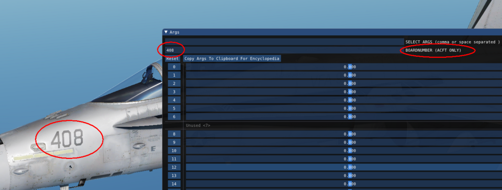 Hi, great thread! I read through the whole thing but did not see a way to change the BORT/Board numbers on the hornet livery. The setting in Model Viewer is under the arguments section but it isn't clear what command that translates into for the scenevr.lua. Any help is appreciated. Thanks! Chirp