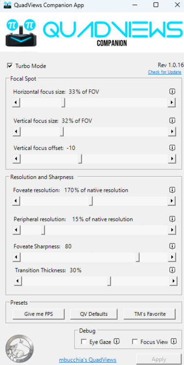 OK so when opening Pimax Play, device settings, and then games, you have the option to set render quality. Basically this is how many pixels the GPU has to render. So with OG Crystal that's 2880x2880 for each eye. So with render quality at high - the headset is asking for a pixel for each, meaning 16,128,000 need to be rendered. However, by using Tallymouse's Quadviews Companion tool we can adjust that. So for the foveated area I have 170% (so let's say that covers 1/3 of what has to be rendered by the GPU), that section alone is now asking for 8,225,280. However, I have set the peripheral resolution to 15%, which covers the remaining 2/3 of my view, I need to render 1,596,672 there, making a total count of 9,821,952 that have to be rendered in my headset. null Before when I had render quality set to medium, the headset asks for fewer pixels to be rendered than what the headset actually has, at 75% - so by default it is asking 12,096,000. I used to have foveate resolution at 200%, and peripheral at 30% to make up for this. Foveated asked for 7,983,360, while peripheral resulted in 2,431,296, for a grand total of 10,414,656. So ironically with my new settings my pixel count is slightly lower, but because the base resolution the headset is asking for is the same, it feels clearer. Why my stutters largely disappeared changing from medium to high - I have no idea. The GPU workload according to MSI afterburner is largely the same. null