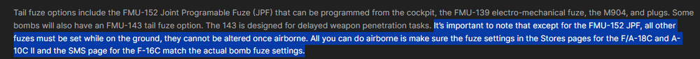 remember, the only fuze you can adjust its settings in the jet is the FMU-152 (which the CBUs dont have). for every other fuze you need to select the desired fuze settings via the ME or via the F-10 ground crew menu. then in order to get correct release parameters based on the fuze settings of the bomb, you need to tell your jet what the fuze settings of the loaded bombs are by adjusting the values in the SMS. all you do is tell the jet what parameters the bomb has, you can not change the bombs parameters by changing the SMS values. and until we get some sort of weapon delivery planner and DTC you will have to do it manually.