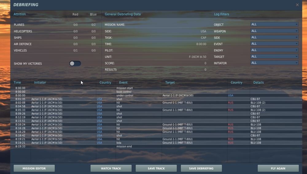 not what im seeing in the viper: in this track here i drop 2 CBU105 and afterwards another 2 CBU97 on target, not a single tank is dead CBU-97_damage_2.trk in this one, i redid the cbu 97 drop, lowered the burst altitude to 1000ft so less spread, still no kill at all: CBU-97_damage_3.trk 1x blu 108 does 11% damage. of course if you are lucky and 10 go for the same tank then it dies, but that is very very very rarely the case regarding the "fuzing option": the only changeable thing is AD and burst altitude. yes with lower BA you get more bomblets in a smaller area, yet are still at the mercy of how they disperse themselves (skeets flying everywhere with sensor fuze). still with that many tanks in the area and so many bombs dropped there, getting no kill at all is not an acceptable result. hell, most of them are still operational, only 2 have been slightly smoking now even if the bomb is modelled correctly, the ground units lacking any sort of damage model that would allow the bomb to perform adequately doesnt make this easier. so as of now the bomb feels like it underperforms, might also just be that the ground units arent in a stage where the bomb would do adequate damage. whichever is the case, currently this bomb doesnt do much against MBTs, even against T55.