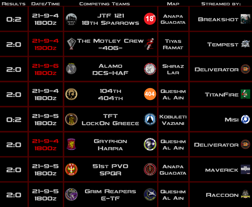 Rules Format will be 5 v 5 Best of 3 Teams will be allowed to have mercenaries but they may not have more than 2 and must not be members of the opposing team Bullseye will be centered between two fields with a 74nm bubble 1 Sortie per pilot no respawns any pilot who has crashed or has been shot down must disconnect from the match server Jester is allowed Any in air disconnects are considered dead and may not return No Stream sniping No abuse of any bugs or exploits whether they are known or not No ECM A round is won if a Team controls the area for 5 minutes or eliminates all opposing aircraft 1 Aircraft must land at the opposing airfield to consider the round a win Weapon Restrictions: 6xR27R/T, 4xR73, No Fox3s, No A/G weapons, No Talds, No 9x, No ER/ET, No Nuke Failure to abide by rules will result in forfeit of the round RTB for INS or Payload issue is allowed must be done before team enters bubble Be friendly to each other Squadrons can field two teams but may not mercenary for each other and cannot consist of the same pilots No AWACS or EWR will be available Not every rule can be written if there are any questions please ask in discord or PM me No intentional Iron Dome At least one representative from each team must be in the discord All planes must be within the bubble within 10 minutes of the first aircraft entering Teams will be assigned maps but if any plays cannot play the map due to performance or not owning it they must revert to Caucasus. However if both teams agree they may switch to any map they prefer. For Example if Team A and Team B are assigned Cauc but both want to play Syria they may do so. No AOA abuse if you have questions on this PM me I can only provide 1 match server per weekend Teams must decide who will host Host teams must have IC enabled and default server messages. BDA should be disable and all exports should be disabled Server Tacview must be provided for result submission Rule breaks constitute round forfeit if a round ends in a tie it is considered null to the score first team to 2 wins would take the game Schedule .