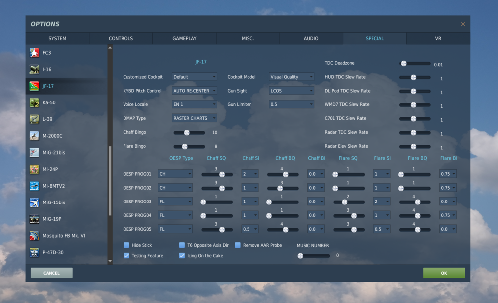 In the special menu when setting up programs if all programs are set to CH or FL programs when attempting to switch between CH and FL using L4 (with the CMBT page on the left MFD) to switch between CMS it will become stuck on either FL or CH the only way to switch would be using the Program button. Not sure if the behavior is correct but for those who wish to not have a combined program this can be a bit frustrating. JF17 MFD CMS Mode.trk