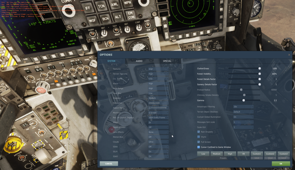Hey everyone. I'm not sure what happened. DCS used to run buttery smooth for me, now I'm getting huge stutters and freezes every couple minutes. DCS FPS counter says I'm in the 60-90FPS range depending on map and conditions but it will freeze up momentarily out of nowhere. Its making precision flying like A/A refueling pretty difficult. Is anyone else having issues? Recently updated to the current beta build. Not sure if this is the issue. 1440p at mostly high settings. This is happening in Single player, I haven't tried multiplayer. I lowered visible range and shadows but that didn't seem to help anything. i9-10850k RTX 3070 32GB DDR4 DCS loaded on its own NVMe M.2 SSD EDIT: Added a screenshot of my settings and the FPS counter. My FPS is good but my frametime seems insanely high?