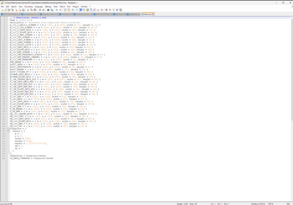 Very interesting. I know the helios code is a bit “messy”, as the developer says, when it comes to translating certain monitor configurations. I’ve been hit or miss getting a monitor to work correctly being on the left of the primary, by letting Helios write the monitor file. It sees the left screens as negative coordinate values coming from windows, and isn’t always happy about it. It’s just doing what it thinks DCS wants. I know lots of users with more complex screen setups seem to have better luck writing their own file instead of letting helios produce it. Helios also has trouble producing proper triple screen setups. - Curious if, in your setup SkateZilla, you are able to use your two left monitors for other windows applications while playing dcs. Or does dcs still see then as part of the screen space, just leaving them blank? - I’d be interested to see your monitorsetup LUA for that particular configuration, if you would be willing to share I would like to compare and do some testing on some modified Helios monitor setups. - as for his mfds being before the viewports. I will check my Helios monitor file. It could be written that way due to Helios’ “patches”( modifications to the core files) for exporting things like the mfd’s, ded, eufi’s etc. <— I will revisit this one. That piques my interest as well. I suppose my previous statement should have been “ limitation based on what Helios THINKS dcs wants” -
