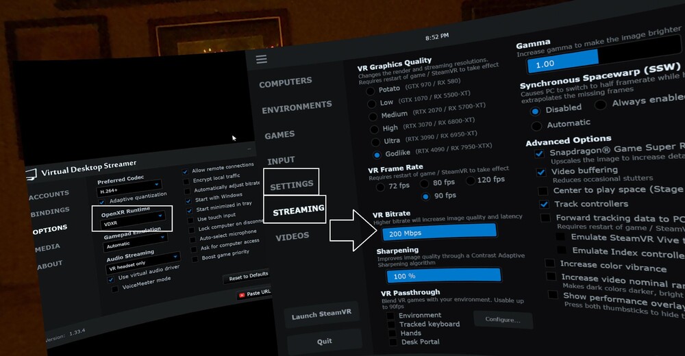 Hello again, I am sorry I forgot to anwear your question. I tested Godlike inside of Virtual Desktop (VD) but now I am running High (RTX 3070) since I have a RTX 3080, but perhaps I should try to adjust it up again? I so pleased with the multiplayer framerate I got (the post above this one) so I dont know if I dare to change anything again