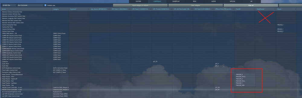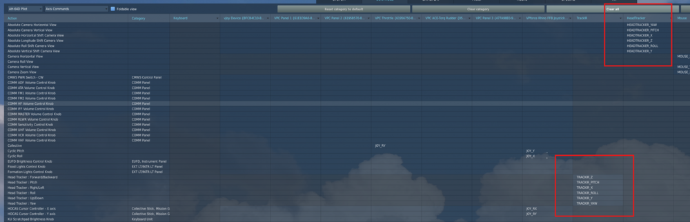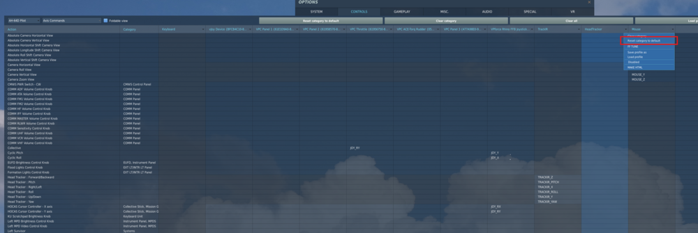 EDIT: For some reason when i posted this, all the text was gone and it only included the images. Ok, let me retry this, one second: I'm a bit late to this thread but I was messing around with head tracking settings last night and started having this issue. I figured out what appears to be the source of the bug and how to work around it for now. For context, for head tracking I use OpenTrack where i generally use a Tobii Eye Tracker device or iPhone with it. For starters if you go into control settings for ah-64d pilot and goto the Axis Commands section, you should notice two columns of binds for head tracking, TrackIR and HeadTracker as seen here: it appears the bug is somehow related to the HeadTracker binds -- so what I did was click the little black down arrow in the HeadTracker column, and selected "Clear Category". It should now look like this: This appears to fix the bug. If this ends up breaking your headtracking completely for whatever reason, you can easily restore the default settings again by clicking the down arrow under HeadTracker and select "Reset category to default": If for whatever reason you don't have any binds for TrackIR -- do the "Reset category to default" for the TrackIR column. Hopefully this helps some of you out, and hopefully it gives ED some insight into this bug for them to fix! -