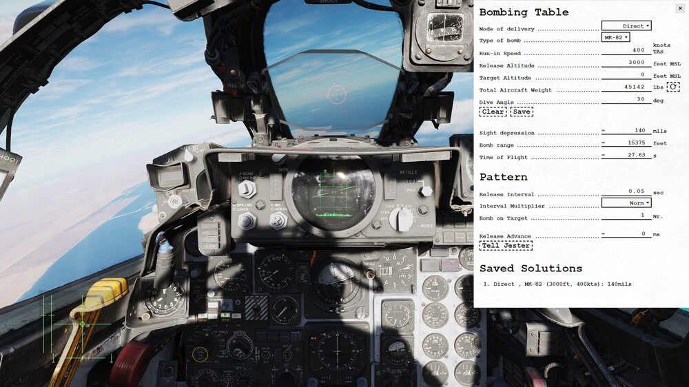 Fair question! Yes, as far as I am aware, I did everything correctly using the bombing table, in both DT and Direct modes: Set delivery mode, set bomb type, set airspeed, set dive angle, set target altitude, set release altitude. And for DT, I did say "Tell Jester" and heard him verbally acknowledge my input. (Please, keep checking if I did anything dumb...I 100% would not rule anything out!)