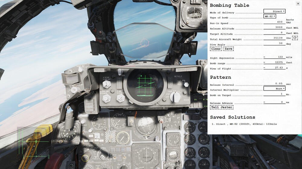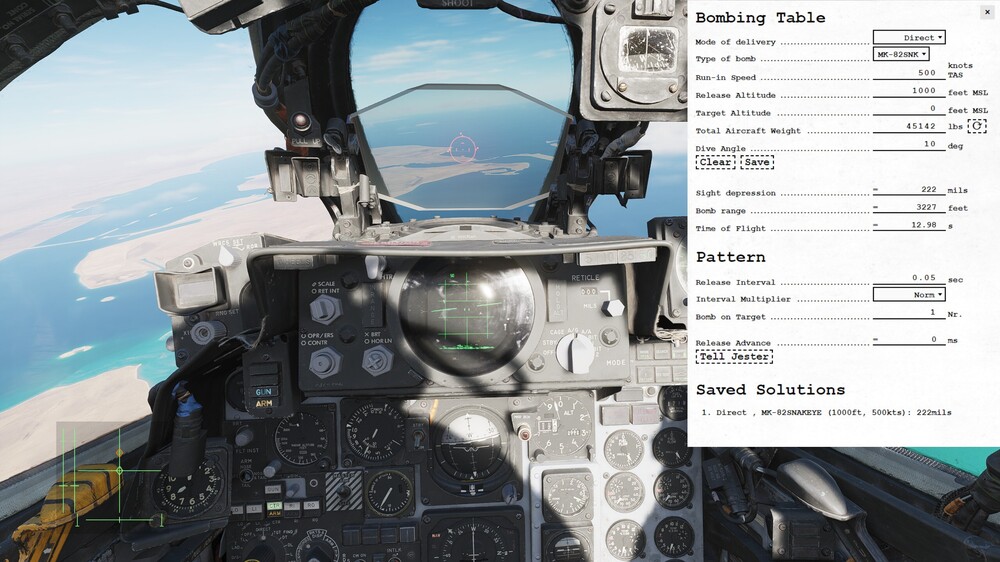 The good news is that I think I figured out what I was doing wrong in DT! When I did a test run with DT, I nailed the target on my first attempt. (I think I had the aircraft out of trim on my previous attempts, so I kept fighting the controls and at the moment Jester locked on to the ground return, my reticle was oscillating far up from the target.) The bad news is that Direct mode still seems wildly off. I've attached a quick track, as well as a screenshot of the bombing profile I set up. (I do realize that I failed to say "bomb on target: 2," but since I dropped in pairs anyway, I'm not sure this would have made a massive difference anyway.) I flew a pretty garbage run, to be frank, but, as far as I can tell, these were my mistakes: 1. slightly slow 2. slightly low 3. significantly too steep of a dive angle But all of these should, according to my understanding, mean that I drop the bombs short--instead, they fall way over the target. Manual Bombing Issue.trk