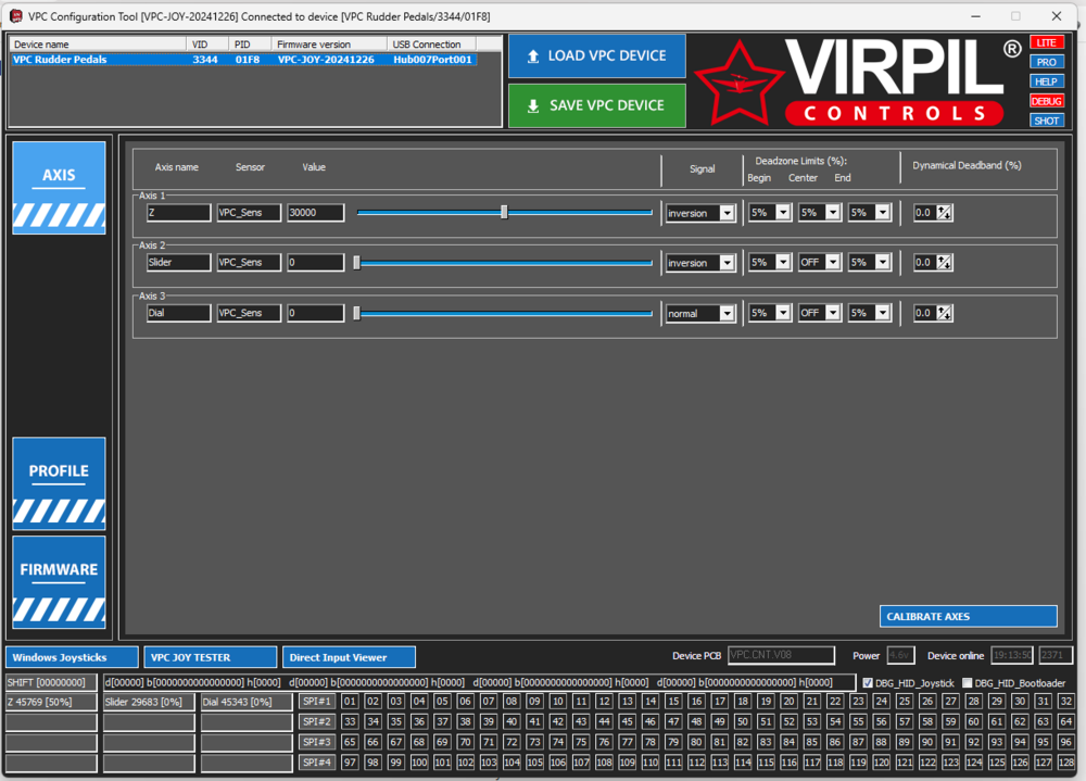 If I use windows Game Controllers to inspect game controllers I can see the VPC Rudder Pedals and when I check the properties I can see Z-Axis, Slider and Dial fine and they work, react to me using them on the hardware.