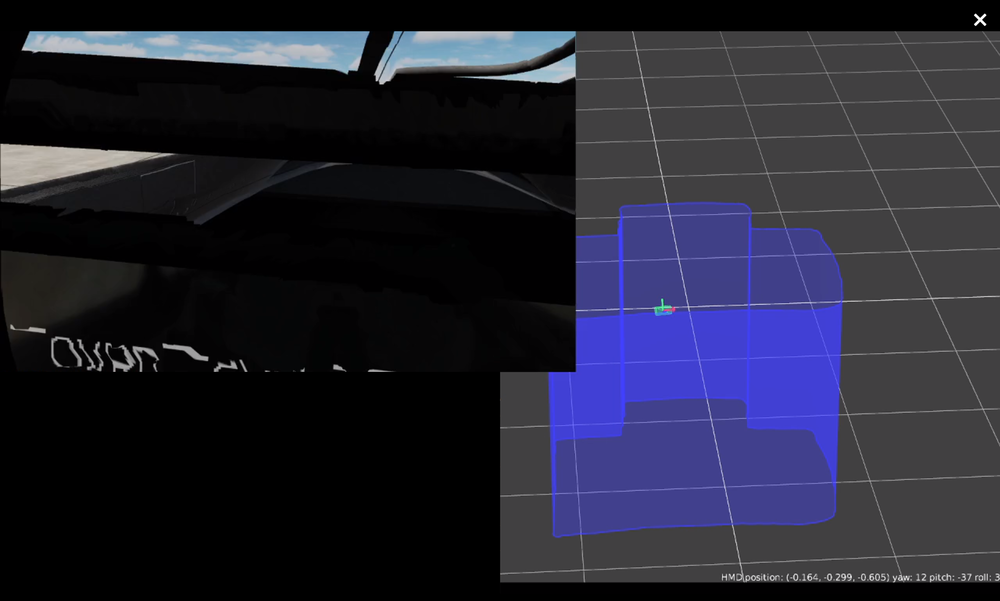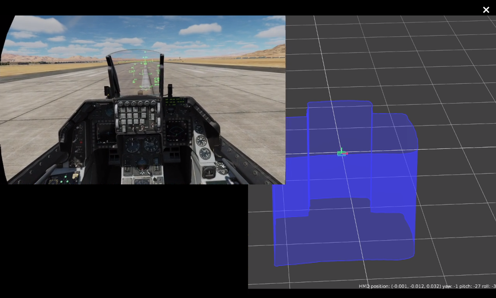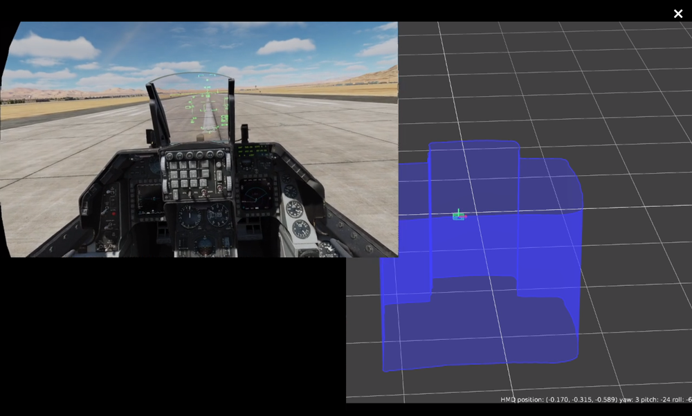 tl;dr: The problem is caused by an uncommanded realignment of coordinate systems by DCS, explanation below. I could reproduce the same problem that I had with intermittent tracking problems by taking the headset off, waiting for it to reset itself, and then putting it on again. In both cases, the position tracking is lost intermittently and later reestablished, and the effect on the head position in the cockpit is the same. There are two sets of coordinates, one in the game world and one that is reported by the VR headset. Let's call the head position coordinates in the game world [Hx, Hy, Hz] and the VR coordinates [VRx, VRy, VRz], and let's assume that the normal head position in the cockpit is at coordinates [Hx=0, Hy=0, Hz=0]. For a normal cockpit view in VR, whatever coordinates the VR headset is reporting when the player's head is in its normal position must be aligned with the game coordinates. This is also essentially what the "View - Recenter VR headset" function does. In my case, the VR coordinates for my normal head position in the cockpit are roughly [VRx=-0.17, VRy=-0.315, VRz=-0.589]. These coordinates are aligned to [Hx=0, Hy=0, Hz=0] when everything is working properly (in other words, [VRx=-0.17, VRy=-0.315, VRz=-0.589] == [Hx=0, Hy=0, Hz=0]). Here is a picture of the initial position in the cockpit, with VR coordinates [VRx=-0.17, VRy=-0.315, VRz=-0.589]: Then, whenever the position tracking is lost, the headset stops reporting any (valid) coordinates. When the position tracking is later reestablished by the headset, the headset starts reporting valid coordinates again: As it can be seen in the picture, the coordinates are again very close to the ones that were reported before the position tracking was lost intermittently. Therefore, one would assume that the head position in DCS should be roughly where it was before the intermittent tracking loss. But this is not the case, because DCS has realigned the two coordinate systems so that [Hx=0, Hy=0, Hz=0] == [VRx=0, VRy=0, VRz=0], which makes no sense, because there is no reason to assume that the headset coordinate system has changed. This is easily confirmed by moving away from the normal player position to reposition the VR headset as close as possible to [VRx=0, VRy=0, VRz=0], which looks pretty much like a normal cockpit perspective again: The solution to this problem is to change the DCS VR code so that no uncommanded realignment of the two coordinate systems is performed. PS: As for why the headset would even lose track when it is not being taken off, just because its cameras can't find enough "trackable objects" and "corners", I can't tell - that thing has accelerometers, gyroscopes, a magnetometer, and several cameras. The cameras should be used for finding the initial position and for the correction of gyroscope drift, but the headset should otherwise mainly rely on inertial sensors and should easily be able to go for quite a long time with minimal drift without using the cameras. I have used gyroscopes under way worse conditions (high acceleration, high vibration environments) and I would expect them to fail maybe every 4 years, not 4 times in 30 minutes. How the headset developers managed to make these sensors less reliable by a factor of roughly 5 orders of magnitude is beyond my imagination.