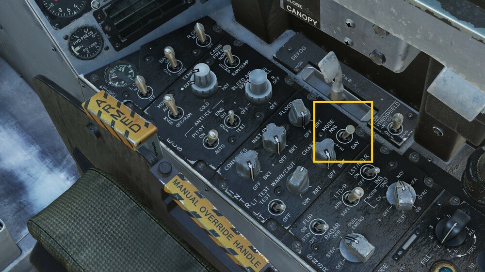 Forgive me if I'm wrong. Perhaps it refers to the NVG mode, which is the green cockpit lighting to avoid dazzling in night vision view. There is a switch on the right from which you can activate NVG mode, which among other things, turns the RPM and BINGO panel green. The light goes from white to green. This is a translation from Google Translate. I hope I haven't explained something wrong.