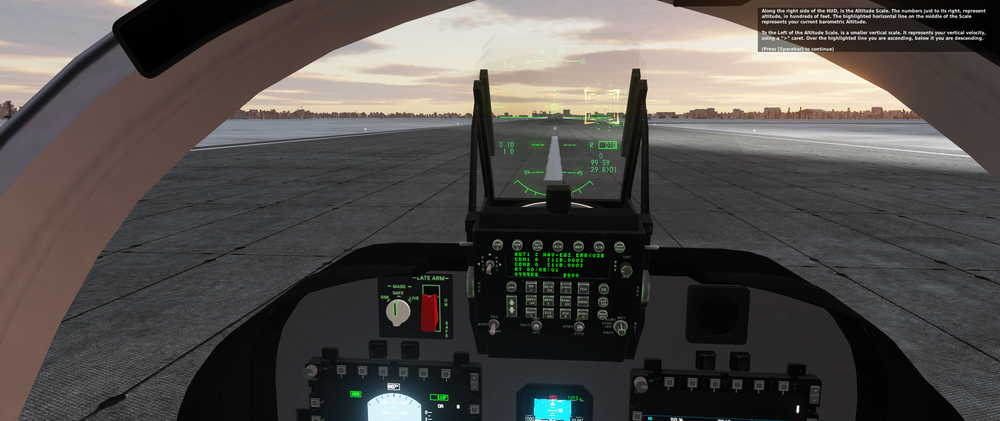 Did the first training mission, but got some trouble with the second one (the one about navigation)... the HUD content is bigger than the "projection area", so the content's "borders" are clipped out, including the angle of attack at the left side, the waypoint's heading caret at the top and the "roll with landing gear down" marker at the bottom. Version 0.3.0b