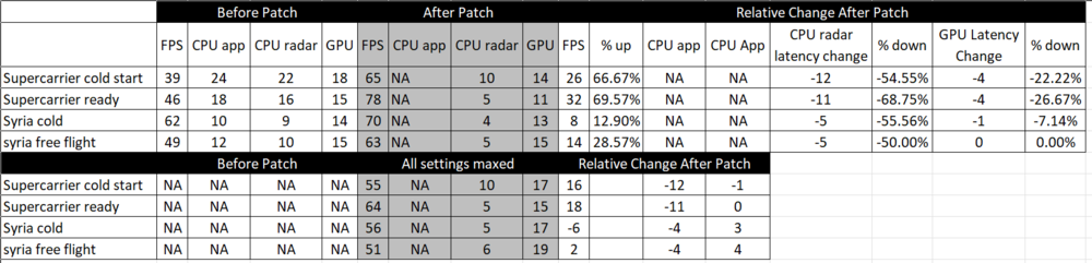Quite pleased with the update. Lots more tinkering to do but overall first pass with the new patch is impressive. FPS improvements between 13% and 70% depending, averaging 43% improvement. FPS average of 49 improved to 70 in my standard settings that I have been using and up to 57 on maxed settings. I am officially GPU bound with a 4090. VR (Reverb G2) 5900x (No OC) 4090 (No OC) 32gb (4x8@3600) Windows 11 (all drivers and updates) 4 tests Supercarrier cold start Super carrier Launch Syria Cold start Syria free flight nullWhen I say all settings maxed in my test, I mean (almost) everything. All shadows (and all types) maxed, 4xMSAA, 16xAF, not using any of the other filters. Cockpit global illumination on. All running through OpenXR. PD 1.0 in both WMR and DCS. Crystal clear, studder free, rock solid. WIth motion reprojection I hold 45 FPS even with everything maxed. All of this in single player of course.