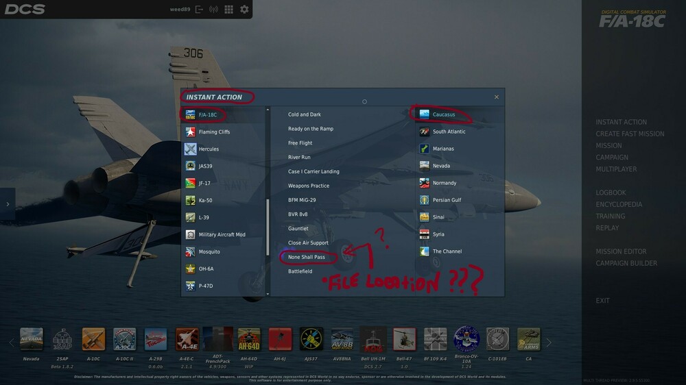THIS LOCATION IS not THE instant fly MIZ folder...they are mission miz files..I Am looking for the INSTANT fA-18 Caucus " where is the none shall pass miz file" and can NOT find it anywhere. Does anyone Know the location of that MIZ file ?