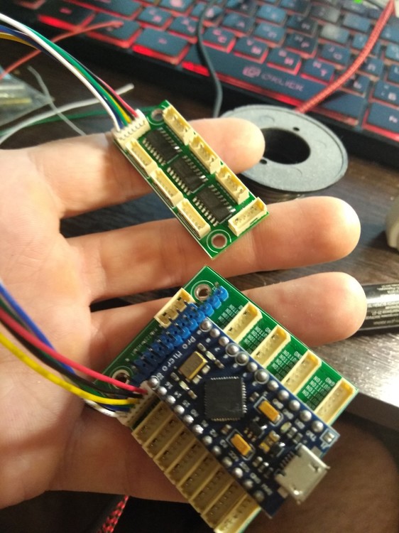 1. ну и собственно электроника которую использовал, от пользователя Swift_CCCP с другого форума, не знаю есть ли он тут. был приобретет регистр на 24 кнопки. Что в итоге получил. 4 хатки 4х позиционные, 1 хатка 3х позиционная (которая под большой палец). 2 курка + 3 кнопки.