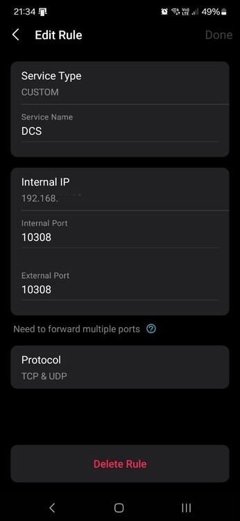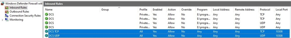 My buddy and I have been troubled by this issue for the last 2 months. We can't seem to connect to one another's private server, but we can see all other servers in DCS multiplayer. We are now both on the latest patch 2.9.8.1107 and just tried to connect to each other but to no avail. Port forwarding settings seem to be correct and the port is open per canyouseeme.org. The server is also visible in the DCS server online list, and I have an inbound rule for 10308 on TCP and UDP on windows firewall. We did try turning off the windows firewall, but that didn't help. Our ISP claims they are not running on CGNat, and we have no issues connecting to each other on different games. If I create a dedicated server through DCS Server Hosting (ready-room.net), we can both join the server with no issues. If anyone has encountered this before, would appreciate your advice on what else to check. Thanks!