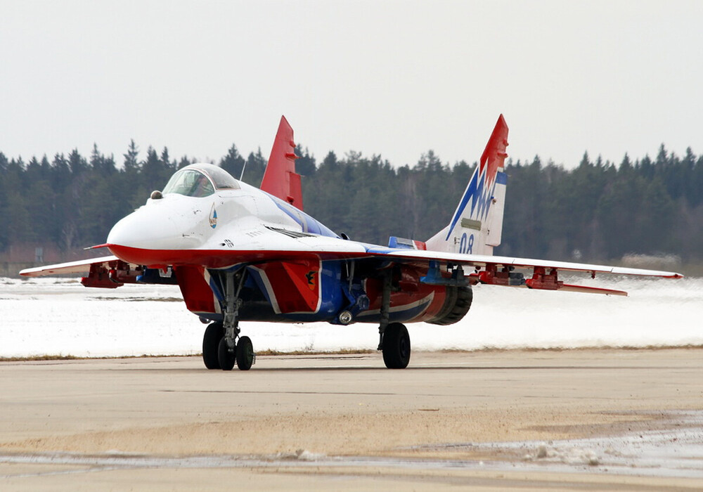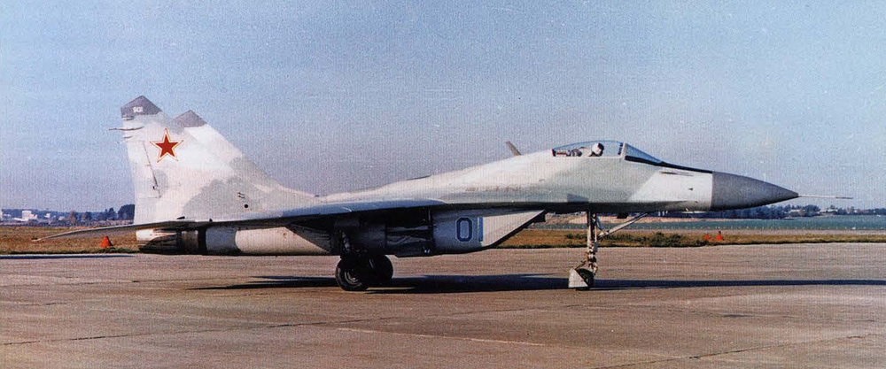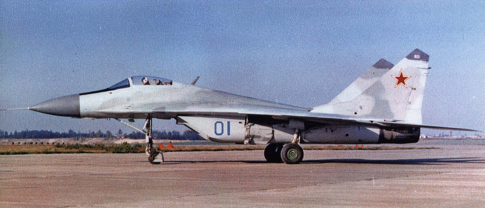 MiG-29 fact 'Aircraft 901' coded '01 Blue', was the first flying prototype of the MiG-29 (note the '901' on the dielectric fin caps). This aircraft differed from all subsequent MiG-29s in having a longer wheelbase in an attempt to enhance the aircraft's directional stability on the ground. The nose wheels are located well ahead of the air intakes, hence the large mudguard enclosing the nose wheels. No ventral fins are fitted yet. Note the three-tone camouflage, the one-piece curved windscreen, the original narrow-chord rudders and the 'beaver tail' fairing between the engine nozzles.