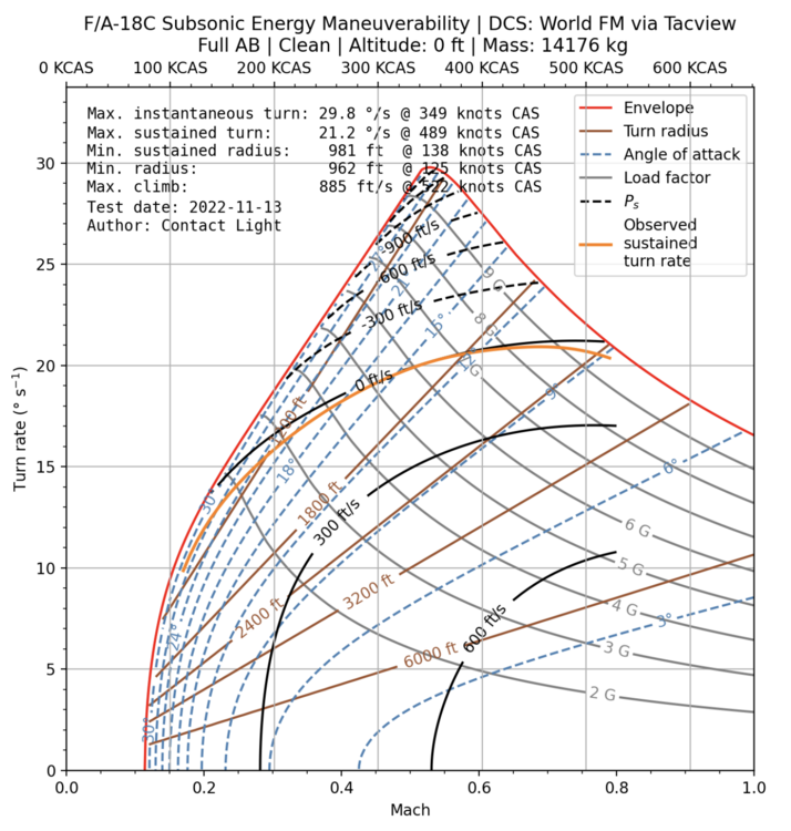 A few things. First. We know this is the case because of many interviews/discussions/comments from pilots who flew these planes. But even more hilariously, you yourself used Wilbur's post when you were talking about your "data" Second. I respect your opinion, but you don't get to have your own facts. Your test method is wrong or you don't know what you're doing. Your post is the one that is sprouting nonsense Here are the graphs made by Contact Light with all the extra information you wanted. Notice how Max instant, Max sustained turn, max sustained radius and min Radius have all F-16 dominated Third. Let's take wilbur81's information above, and we can see that this is not the case for the F16 viper in DCS And don't take it from me. You want more in-game data, here is a video. Finally you're most welcome to try to come on the dogfighters server and try to outrate the hornet