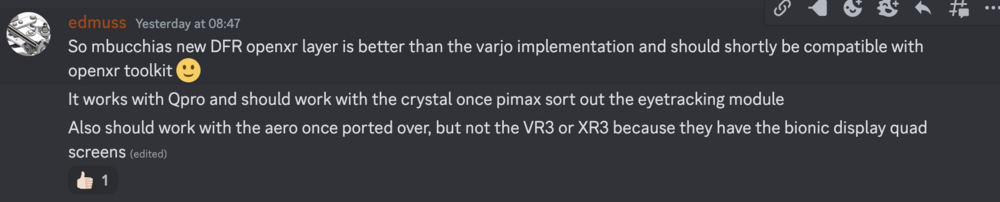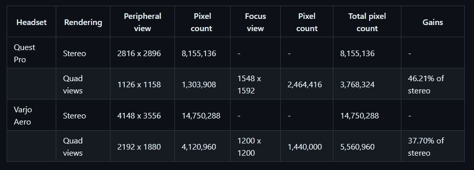 You're damn right it aint good, IT'S GLORIOUS! I have mine set to 0.95 x 0.95. At the settings you guys run FOV (0.85 from memory) I had what I'm going to coin as 'refrigerator vision' - felt like I was looking through 2 vertical rectangles - fridges. When those posts were going up, I didn't want to crap on the parade so didn't say anything. My IPD is 63 which is slap bang in the median. Maybe build tolerances within the headset? However we know by watching Lukas' video that the panels in Quest Pro are not the same ones found in the cheaper headsets which only utilise a fraction of the actual screen - don't know https://github.com/mbucchia/Meta-Foveated/wiki pre-compilation code for Dynamic Foveated Rendering for Quest Pro via Quad Views has been posted 4hrs ago. No release (compiled code yet) but instructions are now live and I'm sure the full release is imminent. Its a good idea to go through them whilst we wait nullThe gains seem very high for us even more so than our Verjo Counterparts. Look at the % reduction in render which isn't a slouch either -
