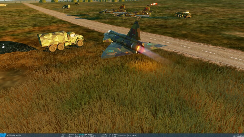 So I've been trying out roadbases all day and one thing that would really help is a ground crew radio command to help turn you around. There's not much room to maneuver on those cramped Caucuses roads and the nearby FARP personnel will happily refuel and rearm your jet, but help you turn around or get off the grass? "You're on your own, pal!" Alternatively reducing grass friction while near a FARP would be also welcome. Not that I don't think getting stuck in the mud isn't realistic - it is, but in real life you'd also have support staff to help swing the jet around, and you shouldn't have to eject or spend a full tank max afterburning to inch across the grass. edit: Placeable tarmac or hardened ground would help too.