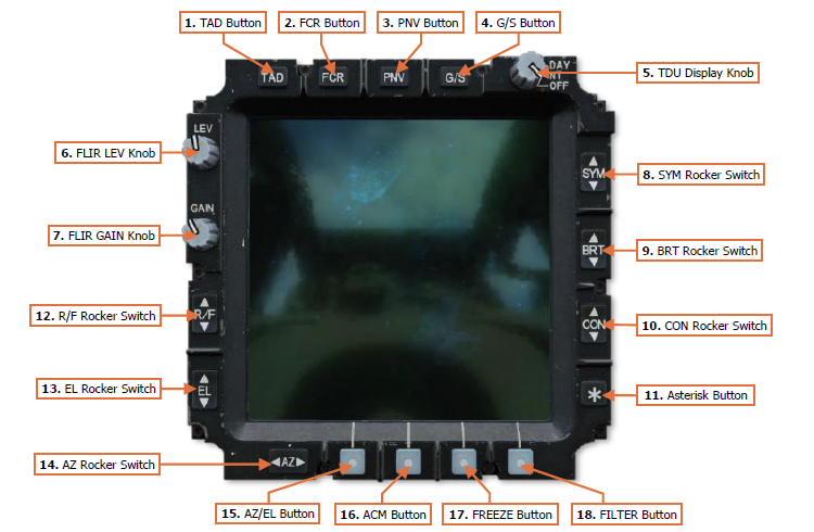 Page 74 of the (new) manual does a good job of explaining this. 8. SYM Rocker Switch. Controls the brightness level of displayed symbology on the TDU or within the CPG’s HDU. When the CPG’s selected sight is HMD, the symbology within the CPG’s HDU will be adjusted. When the CPG’s selected sight is TADS or FCR, the symbology brightness on the TDU will be adjusted. The symbology brightness may be incrementally adjusted using short presses, or continually adjusted using continuous presses. 9. BRT Rocker Switch. Controls the overall brightness level of the TDU or CPG’s HDU. When the CPG’s selected sight is HMD, the overall brightness level of the CPG’s HDU will be adjusted. When the CPG’s selected sight is TADS or FCR, the overall brightness level of the TDU will be adjusted. The brightness level may be incrementally adjusted using short presses, or continually adjusted using continuous presses. 10. CON Rocker Switch. Controls the contrast level of the TDU or CPG’s HDU. When the CPG’s selected sight is HMD, the contrast level of the CPG’s HDU will be adjusted. When the CPG’s selected sight is TADS or FCR, the contrast level of the TDU will be adjusted. The contrast level may be incrementally adjusted using short presses, or continually adjusted using continuous presses. 11. Asterisk Button. Resets the overall brightness and contrast levels to their default settings. When the CPG’s selected sight is HMD, the overall brightness and contrast of the CPG’s HDUwill be reset. When the CPG’s selected sight is TADS or FCR, the overall brightness and contrast of the TDU will be reset.