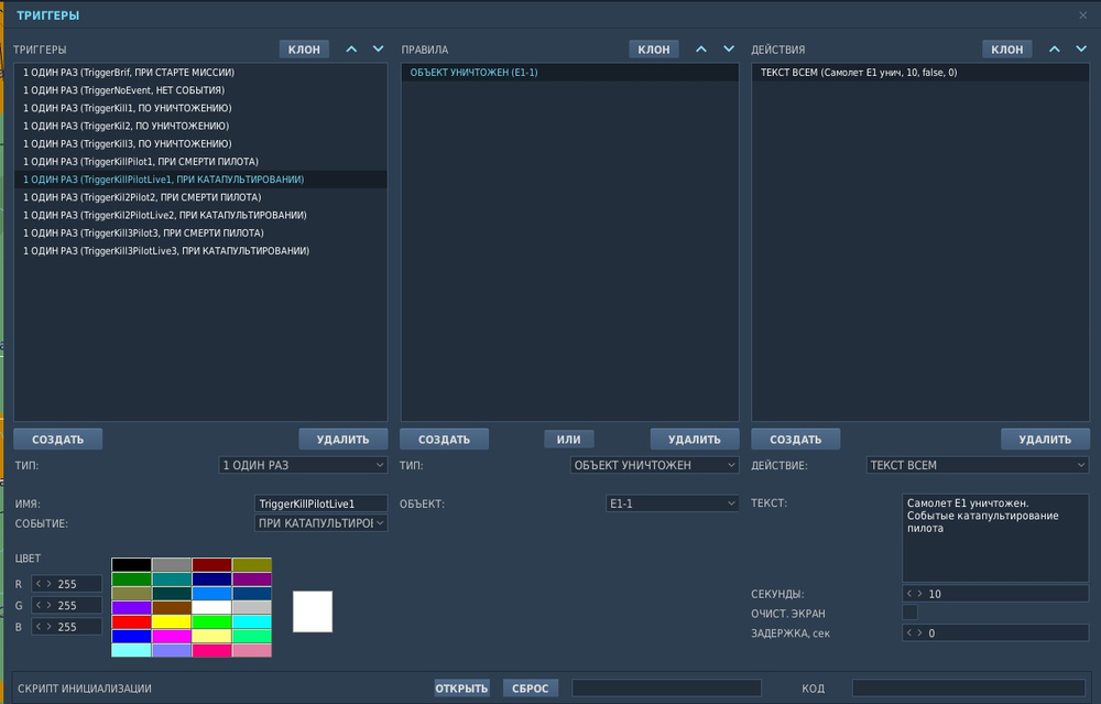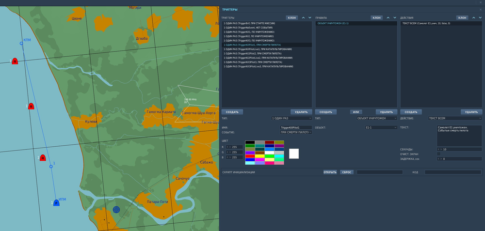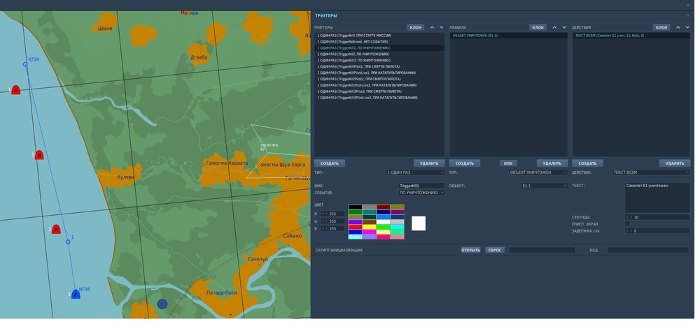 Добрый день, уважаемы форумчане и сотрудники ED Изучаю редактор миссий, зашел в тупик по триггерам. Есть ощущение, что не понимаю какие-то базовые принципы, без которых дальше продвигаться не получиться. Прошу вашей помощи. Отладку делаю через действие Текст всем. Прочитал, что для оптимизации надо делать триггеры по событию, иначе сильно грузит процессор, но не могу заставить работать некоторые триггеры. 1. Не срабатывает триггер по событию Старт миссии. Пробовал по этому событию выводить текст на экран и присваивать флаг. Сообщение не выводится, флаг не инициализируется. Если создать триггер Без события - всё работает. 2. Не могу понять как работает триггер по уничтожению. Про него прямо в мануале написало в качестве примера, что используйте на событие уничтожения, чтобы проверять, что уничтожили. Я вешаю проверку, но триггер не срабатывает, действие не выполняется. При этом события Смерть пилота и Катапультирование отрабатывают. Или он только для наземки? Что тогда использовать для авиации? Я создал небольшую миссию для тестирования - бот Сушка гоняет 3 винтовых бота. События Уничтожение происходит, но не срабатывает триггер. Если то же самое назначить на событие Смерть пилота или Катапультирование, то всё работает, сообщения выводятся. Аналогично с событием Старт миссии. Файл миссии приложил. Скрины под спойлером. Версия DСS из Steam, не бета. Спасибо. KillTriggerTest.miz