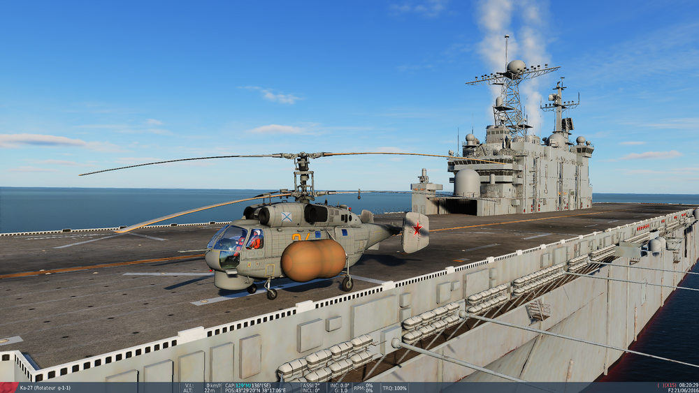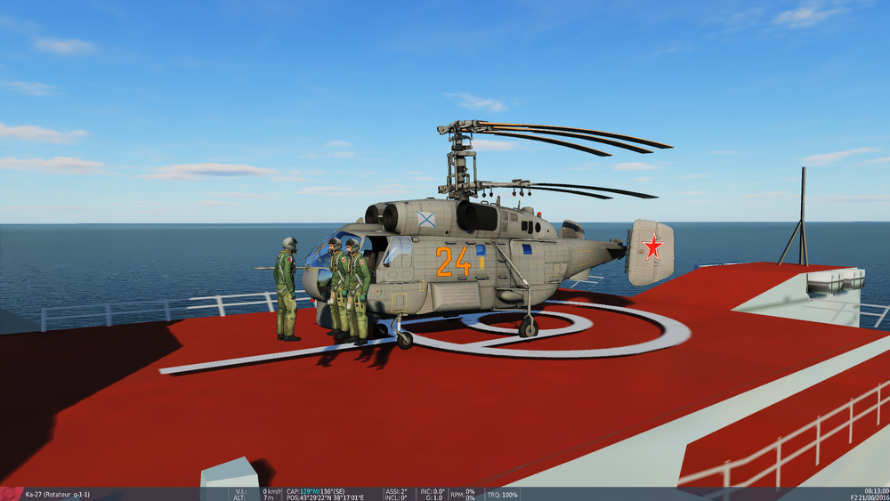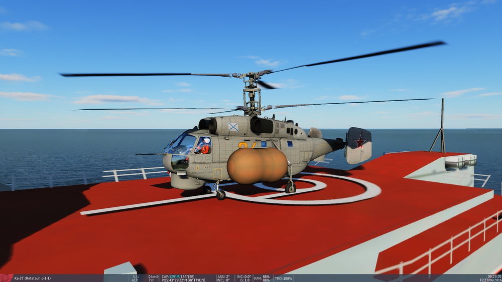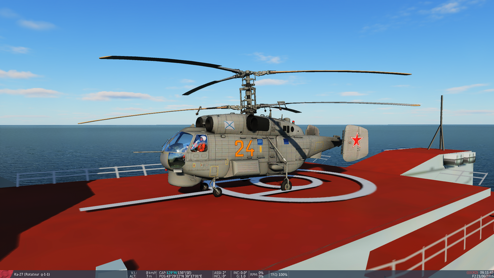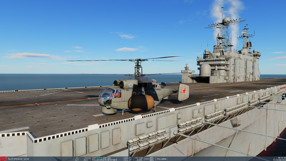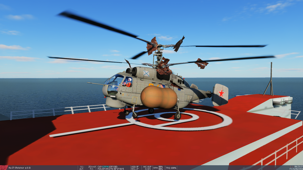 Hello, I have a problem with the Ka-27 concerning the takeoff phase after the "Landing-Refueling" order on a ship. The context: After the Ka-27 crew returns to the helicopter after landing; at the time of the Start-up, or at least when the personnel appears in the cockpit, the inflatable landing floats are triggered and cause a problem later on the takeoff phase. More precisely when the RPM of the two engines reaches 88% necessary for takeoff, it is when it tries to take off that it "loses altitude" (with a height of its tires that end up in the ship), then explodes because of collision with the ship. I tested with the Kirov-class battleship Pyotr Velikiy a first time, then with the Neustrashimy, and finally the Tarawa. The result was the same every time. I don't have any active mods and my game version is 2.9.13.6818.2 as of today. Pictures if it can help: 1 - Correct landing on ship : 2 - The crew disembarks for refueling : 3 - The crew reembarks to resume the flight to the next Waypoint without specific order, however this activates the inflatable floats : 4 - Arrived at 88% RPM, we hear from the sound of the engine that it is going to take off. Nothing to report for the moment. 5 - Sudden "loss of altitude" then climbs a little and has damage : 6 - The result is an explosion of the helicopter in 100% of cases. 7 - Same on the Tarawa: