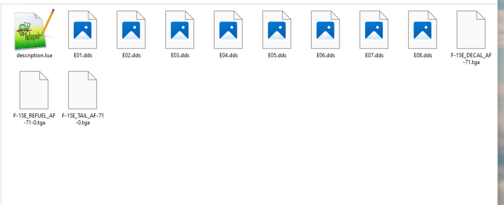 I'm trying to download some F-15E liveries. Once I extract them and add them to the x:\saved games\...\liveries folder they look like this and don't work: Previous liveries show the x.dds files as thumbnails but these ones don't. Tried various things, such as: - virus on/off whilst downloading/extracting - livery folders in x:\dcs\openbeta\bazar\liveries and or x:\saved games\...\liveries\F-15E, etc. Managed to get some F-15C liveries downloaded and they work fine, so the "method" seems okay, just unable to get the F-15E ones to work??? Random issue or incompetence? Any ideas?