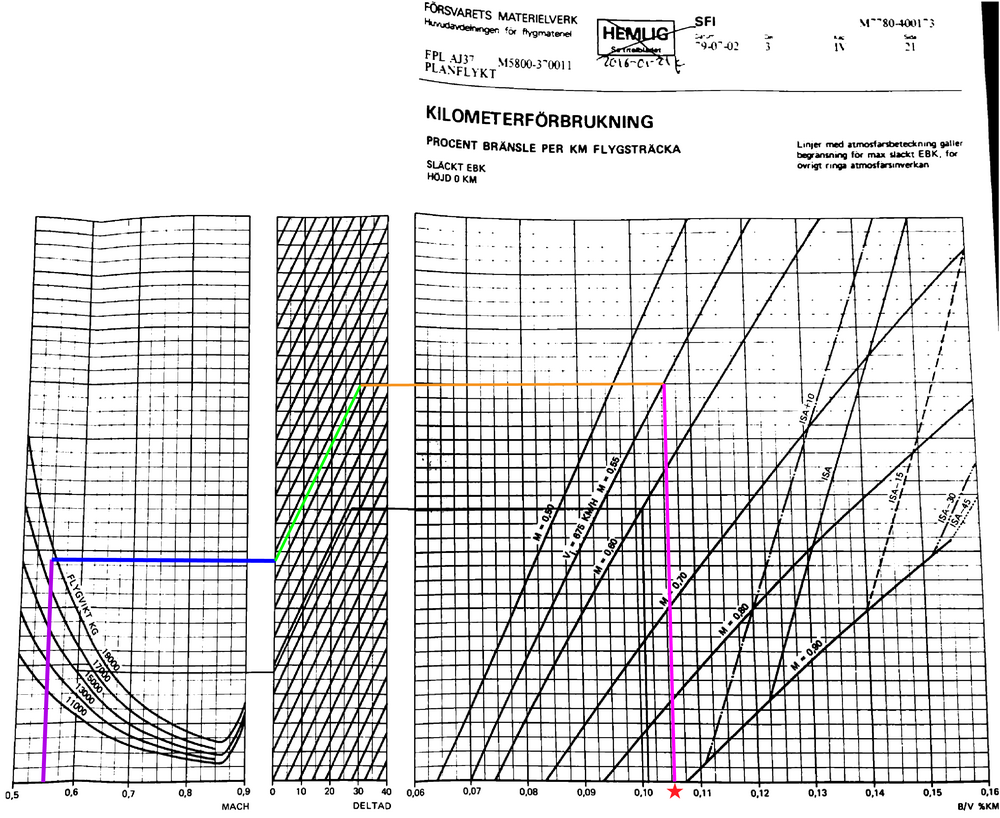 For the below kilometerförbrukning nomogram, how do I calculate the percent fuel per kilometer? I've drawn (red) 0.55 mach, turned right (purple) at 1600kg flight weight (flygvikt). Where do I turn up on the DELTAD quadrant? I assume that this is a point in time, so if for a flight segment I start at 19000kg and end at 13000kg, 16000kg would be a decent approximation of the average flight weight. Is this correct? Testing the above approximation for a full 127.5% fuel cycle (rather than just a snapshot in time, since I don't have a way to precisely measure fuel in the tanks), I flew 1075km at ISA-15 and 5m altitude for approximately 0.12 percent per kilometer.