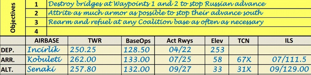 Kneeboard (2M1_Mission Data Cards1 NEWpng_Page1v2.png) for mission 1 is showing a departure from Incirilik. It's also referring to bridges at Waypoints 1 and 2, which is incorrect. Also wondering if there are any guidance for what generates a perfect 100 score? I stopped the columns, temporarily anyway, and destroying between 33-48 pieces of armor in each of four attempts scoring 90 each and resulting in a ""Great job! You blew the bridges and slowed them down to a crawl. Shut down your jet and I'll meet you in Debrief." It doesn't seem to be a matter of Pig 1-2 getting shot down, as the score is still 90 if I send her back to RTB immediately after wheels-up. When i try to rearm at the "coalition bases" (Kutaisi and Senaki-Kolkhi, did not try Batumi) to go for more kills, the ground crew ignores me, presumably because they are actually Neutral rather than Blue. If I land back at Kobuleti, it's mission over.