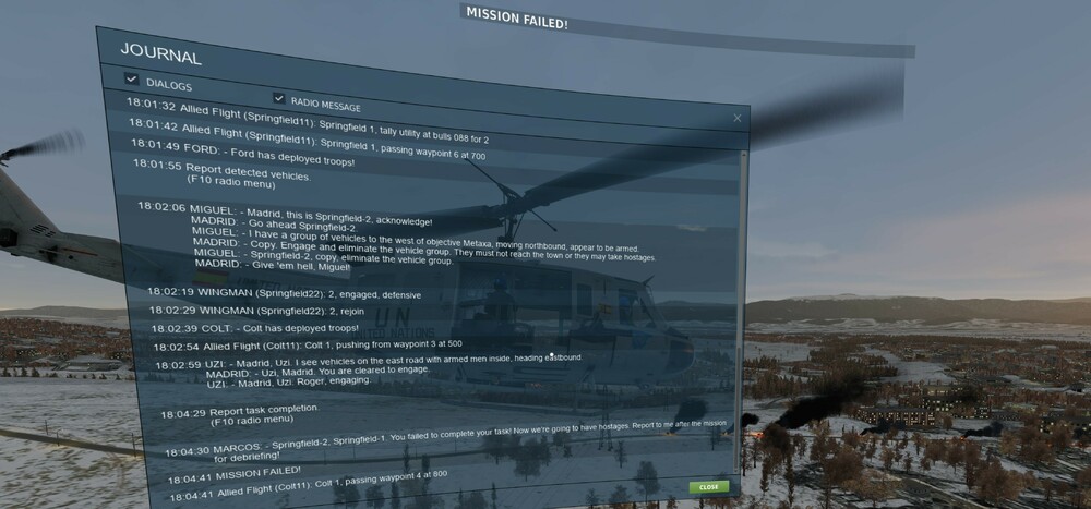Not sure why, but I keep failing this mission (5x times now) immediately when I eliminate the final vehicle in the northern convoy. The tasking said that "they must not reach the town or they may take hostages," and then the mission failure message is "Now we're going to have hostages!" This occurs even if you eliminate the eastern convoy (which is tasked to Uzi) before attacking the northern convoy. Always when the last northern vehicle is destroyed. DCS 2.9.2.49940 Open Beta un-15-good_evening3.trk