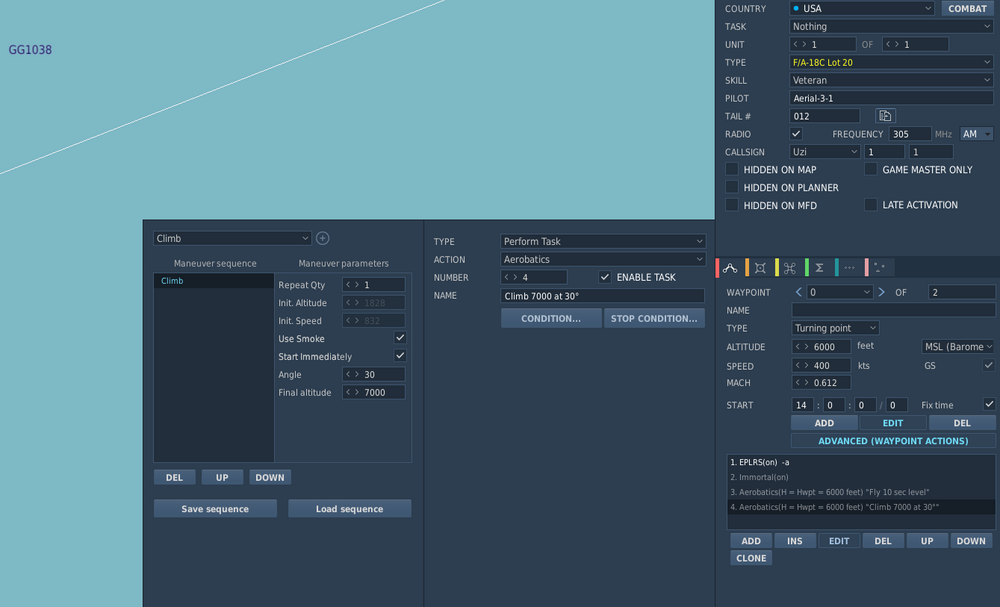 Thanks Vakarian and NineLine, just did the testing and indeed both CLIMB and DIVE target exit altitudes in meters, event though the ME is set to Imperial units. Is this a (minor) discrepancy you guys at ED have in the to-fix list? Now I know this is not a feature-wishes section, but since aerobatics are not a hot topic... I would love to see options "figure entry time" and "figure exit time" so we can set how fast the AI aircraft enters/exits say a 45° bank turn (now it it pretty dynamic). Basically this part of aerobatics is a good playground to train formation flying with an AI leader. Thanks!
