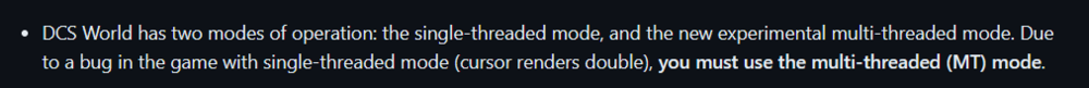 Double cursor means you are not running DCS multithreaded. It's explained in the instructions: https://github.com/mbucchia/Varjo-Foveated/wiki#dcs-world. null -