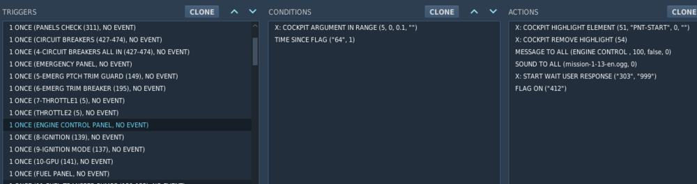 Repeated toggling a message with flags using Space gets stuckvirgo47 replied to virgo47's topic in Mission Editor I needed this for my own single player mini-tutorials (e.g. learning some particular maneuver) and it could be adapted for Client. I'm obviously just a ME beginner, but previously I made a multi-client landing mission which selected the message based on the type. The client spawn detection was in the Lua script (I didn't find other event for it) and so was the message selection, so the flag flow is the same for each client instead of having many flags per client. The mission (for Su-25T and TF-51D, both free planes) is more script-heavy, obviously, and reflects my newbie skill: Multi-client - message toggle test.miz The mission is not the cleanest thing, e.g. the script sends message to the client and cleaning is done by message to all - but in single player it doesn't really matter. I have no idea how this would work in MP, especially with X: START... command which you can't even aim at a single player, so I guess space-based message toggling is not possible there. That said, this really is for simple single player missions to drill something specific. With or without instructions at your will. (Which, of course, you can do with kneeboards.)