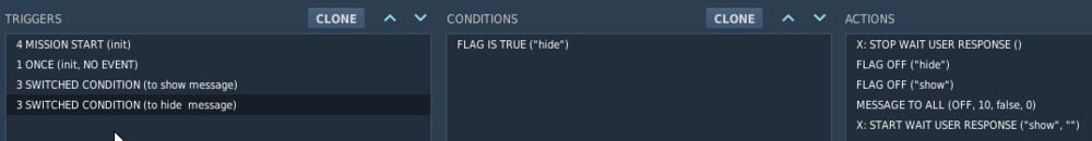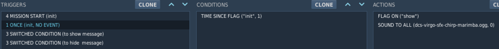 I wanted to create to myself a simple mission with an optional help in a message that I can trigger ON and OFF repeatedly with Space. I decided to employ "X: START WAIT USER RESPONSE" to toggle that message on and off. I soon understood that FLAG IS TRUE is not the most reliable condition compared to TIME SINCE FLAG - especially after the start, however, I got into this reasonably simple design: MISSION START just sets an init flag, This will be checked by ONCE trigger with TIME SINCE FLAG - this will play the intro sound and sets the show flag: And then there are two virtually symmetric switched conditions, one to show the message: And one to hide it: Flag OFF for both may be an overkill, I just wanted to be sure. The problem is, that if I press the space in a rapid succession, the triggering may get stuck in either position - here in ON and with a debug output for both flags (via some F10 OTHER custom script): When it gets stuck in OFF (seeing fainting away in the picture above) the flags are reversed. This indicates that the code in "to show message" ran (ON is displayed) and if space is hit, hide flag will be set - and it is. But the problem is that the "to hide message" trigger is not triggered - which indicates that it probably didn't register the hide in FALSE state before it got to TRUE again. And this is where I don't understand why. I know the mission "code" is not exactly symmetric, one of the triggers is behind the other - but it can get stuck in OFF state as well (tested) - so this is not the factor (or not the only one at least). But my thinking is: To show the ON message, both flags were set to OFF before that, then there as the waiting for user response which would set hide to true. Even if it was fast (it seems the user response may the flag anytime between the trigger 1s cycle)... it would have to happen between considering the first switched condition (to show message) - which would have just successfully run - and the other condition? Because if at least once the "to hide message" was run with hide flag OFF, it would have to trigger the next time (hide flag clearly being on in the stuck state). What kind of (non-)atomicity or parallelism is eluding me here? Now, I have fixed version - the easiest fix being using the TIME SINCE FLAG instead of FLAG IS TRUE - it just gets a bit laggier, but no problem. But I'd like to understand the runtime model of this. Right now I don't get the problem, even with help like https://wiki.hoggitworld.com/view/DCS_editor_triggerBasics#Switched_Condition I'll be thankful for your insight. (Mission that can get stuck included. EDIT: Used Su-25T and "init" flag is gone in favour of TIME MORE.) Su-25T - message toggle test.miz