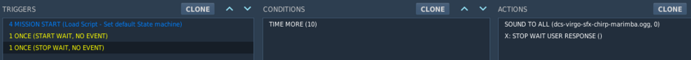 Repeated toggling a message with flags using Space gets stuckvirgo47 replied to virgo47's topic in Mission Editor Thank you for your input. The most important stuff is probably after the last quote. The key point is that the condition must be at least once evaluated as false before it can be again evaluated as true to trigger the actions in the SWITCHED CONDITION. The triggers are tested once a second and in sequence. My bad, I fixed it in the original post. It's for robustness, I use it at the start of my files/snippets because I can place such a script anywhere and be sure that cm exists, yet it does not replace it. It's superfluous here, but that's OK. I don't have great practice with these, so I didn't know about TIME MORE, thanks for the tip, "init" flag was useless, indeed. The rest I understand, I believe. That's strange... I know they are case-sensitive. They are all lowercase in the screenshots as well, unless my eyes are wrong (they're not perfect ;-)) however, the triggering works, and it would have not without the right casing. Let's move on. I got lost in the detail and really didn't describe it properly, so I fixed the first sentence: I wanted to create to myself a simple mission with an optional help in a message that I can trigger ON and OFF repeatedly with Space. Initially the message is ON (ONCE trigger sets the flag instead of writing the message, because I don't want to repeat the message ON command at two places. Message OFF will eventually be clearing the message view, but it's OFF for now for better testing. Because of this repeated triggering, I need SWITCHED CONDITION and two symmetric yet opposite set of actions. I suspect the problem is that Space press event is evaluated in a completely different event loop than the once-a-second trigger loop. So what is probably happening is that Space is pressed multiple times between the whole cycle of SWITCHED CONDITIONs (SC) are evaluated. That is: previously OFF was evaluated, so the last seen "hide" state by the second SC was TRUE, Space is pressed, "show" is set, first SC is triggered, let's say "show" was previously false, so ON message is shown, waiting for the input, Space is pressed, "hide" is set but last seen "hide" was TRUE as well... no trigger, and the message get's stuck. First I thought this happens if I'm too fast between the two trigger evaluation cycles, so it can only get stuck in one of the positions. But the repeated testing shows that it can get stuck in the other situation as well, although less likely (last is a debug output): My goal was to have that trigger action as snappy as possible, but it's probably not easy to make it reliable. As I mentioned, with TIME SINCE FLAG it is reliable - because it always gives the loop the second to see the wrong condition for the flag, yet a bit slower (from Space to visible action 1-2s). It's not a big deal and I'll not fight DCS on this one. (BTW: Irony wanted it, and your mission uses paid P-51D, but no prob.)