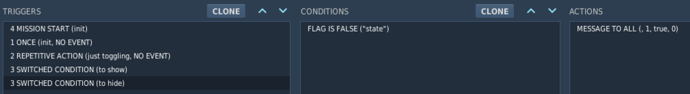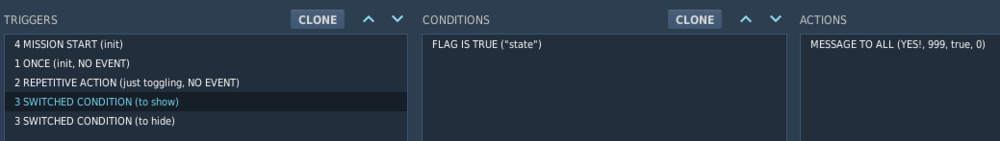 Repeated toggling a message with flags using Space gets stuckvirgo47 replied to virgo47's topic in Mission Editor With the help of my son, we put together two more solutions that are snappier than the original design with TIME SINCE FLAG. First one uses different flag design - flag toggle is used to indicate that the state of the message should change, and state is true when the message should be visible and false when not. ONCE (init) trigger sets flag toggle to TRUE and also plays the sound, I want it only once. This trigger is the only one that waits for user input (which sets toggle) and is a REPETITIVE ACTION. It also contains a short script to switch the state flag from TRUE to FALSE and vice versa (toggle): The other two SWITCHED CONDITIONs are suddenly very simple: And to hide the message: Because the switched conditions are totally opposite (FLAG IS TRUE vs FALSE for the same flag) and the toggling is in repetitive action that always resets its condition flag (toggle), there is no chance of getting stuck - and this is also noticeably more responsive than triggers with TIME SINCE FLAG. And then came the other idea, to use REPETITIVE ACTION (RA) for the original solution. "Wait," you may aks, "why didn't you use RA from the start?" And the reason is just wrong thinking, considering RA more demanding than SWITCHED CONDITION (SC) as it may run ACTIONS more often. One of the original ideas was simply to run MESSAGE command every second (as it would clear view in the final solution anyway), but I just didn't like this unnecessary repetition. But while RA may run actions more often than SC, it doesn't mean it has to. As I already set the flag that guards ACTIONS to OFF in those ACTIONS anyway, it will not be run again, unless set to TRUE again. Which leads us to this simpler solution - this one with flags show and hide: ONCE trigger as before, sets show to true. And then both REPETITIVE ACTIONs are virtually the same, just opposite - one for show: And the other for hide: So if someone is fast on Space, it may trigger successive actions and pass all the true conditions for both flags, but if the things settle (no Space banging), both flags eventually get to the FALSE state and no repetition happens. Sure, the triggers and their conditions are considered again and again, but the same happens for SCs, but this time without the potentially sticky problem. Whenever the flag is TRUE, we do the stuff and reset it. Sorry for re-discovering America for many of you, I guess, but perhaps this helps someone searching for similar trigger toggle things. Final notes: Yes, I know I could have just used a kneeboard. But editing the message is still much easier for me. Yes, you can't use Space in such a mission. Both missions are attached. Su-25T - message toggle - with repetitive toggle.miz Su-25T - message toggle test.miz