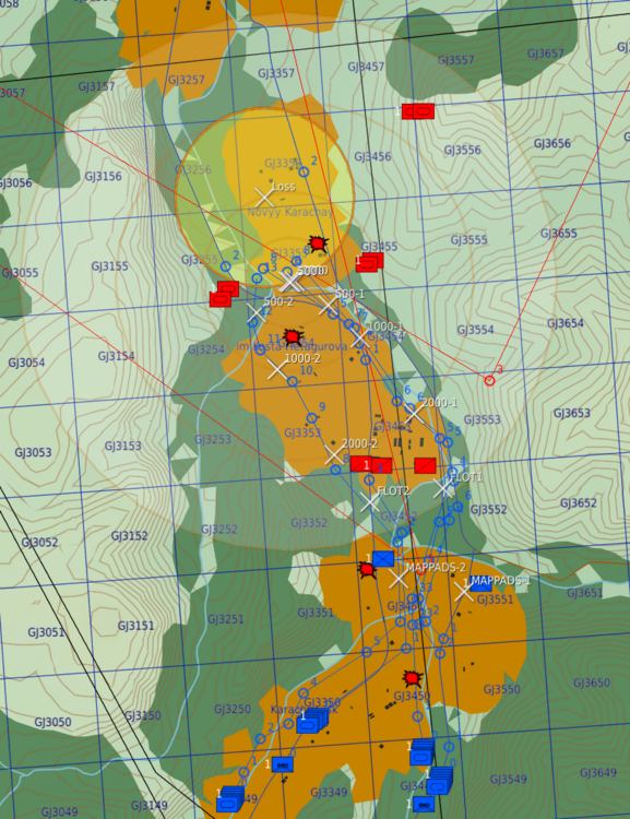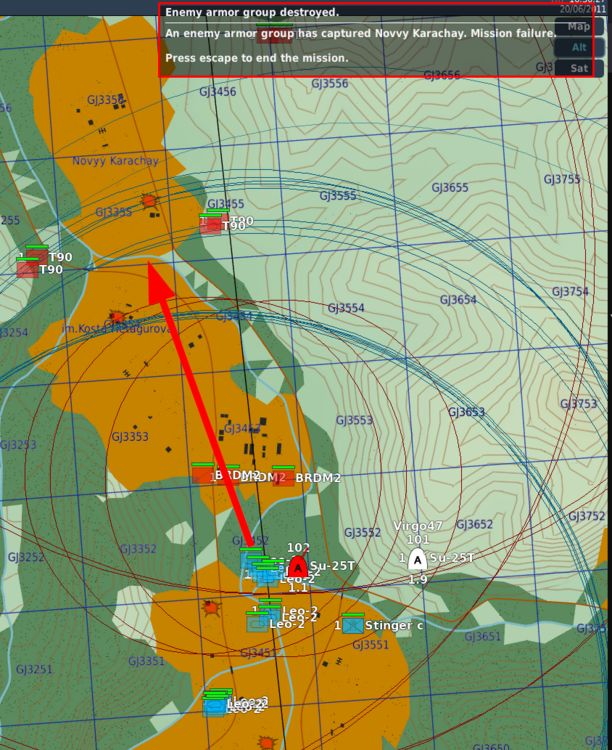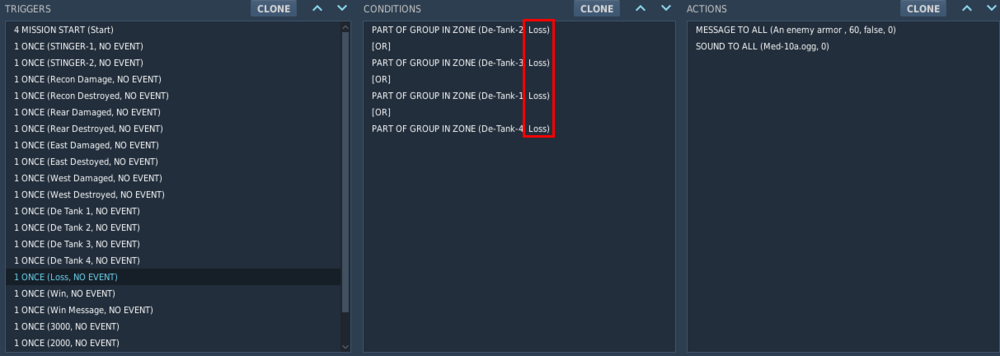 I was trying this mission for a few days and when I finally survived for long enough it often ended in a strange way - soon after the enemy coming within 3000 m to the defended village, the mission ended with failure. I decided to investigate. This is the "Loss" zone: It seems it is used properly in the trigger: Yet, the mission ends like this: And no, no other unit, just recently destroyed, was that far ahead to reach the trigger zone. I saved the track, but it doesn't replay properly. But I made a video of the final less than two minutes, that starts with a glance on the map - and there is no way the units would get that far within less than two minutes. So some ahead unit could have been destroyed, but it wasn't in the trigger: Also, this seems to happen in this very sequence - a group is destroyed and the failure message comes too. I have no clue what happens from the look in the ME. If I manage to get it the next time, I'll try to save the track again.