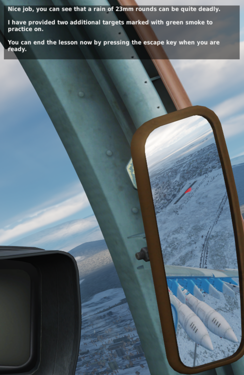 After hitting the first targets, marked with red smoke, the voiceover mentions new targets marked with green smoke. There surely was one before, but now it isn't: It is not only the mirror problem, the same can be confirmed by the direct view, I just liked the voiceover + mirror image here.