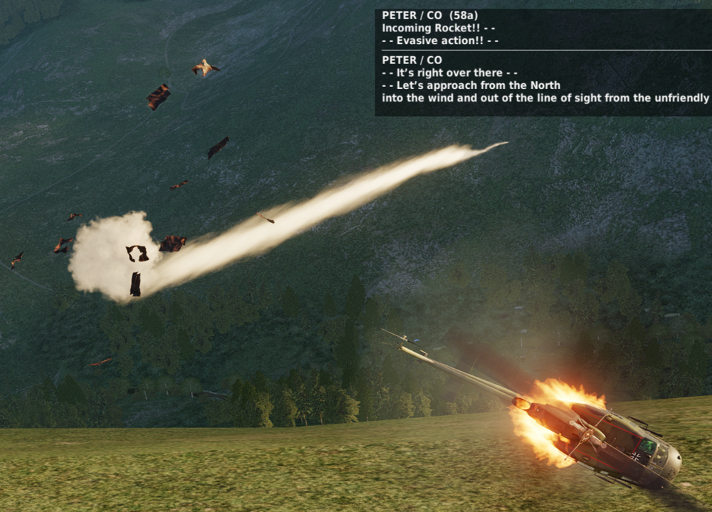 OK, mission finished! Observations: With flares armed, it starts flaring when the missile is incoming. It's 1 flare a second or so, so it may be a good idea to add a few more manually. The automatic flare dispension does not stop afterwards, so the player may want to switch countermeasures to SAFE if they want to keep some flares for the next missile. You'll likely need to dodge one missile if you fly towards the cottage or even none at all if you fly over the ridge. Though, it's more fun to pop up, bait the missile and dodge it right. After the landing with the Alpha team, I let the newly arrived helos doing their stuff for a few seconds before joining them. I haven't encountered another missile after that. It's a fun mission after all, and it's also one of the shorter ones. Packed with action and tricky all the way to the final landing zone. (Just don't go through the orange smoke, obviously.) Case closed, one more to go! -